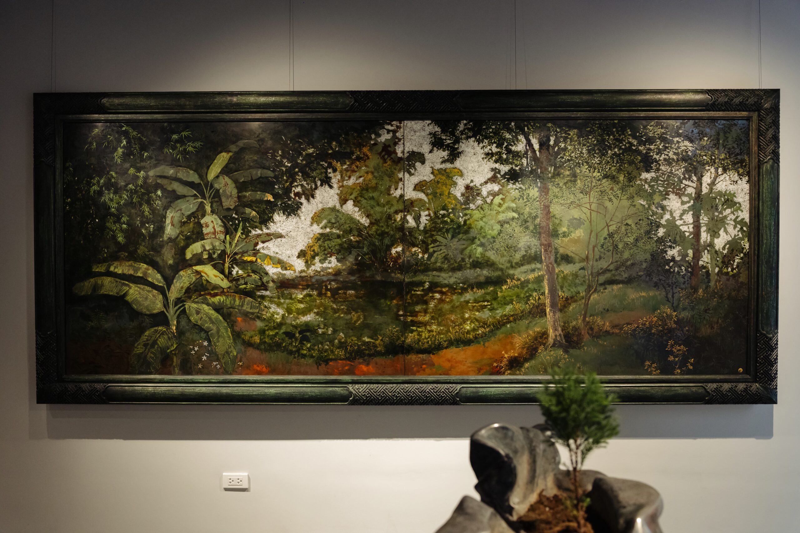 Ngay từ những bước đầu tiên trong không gian triển lãm, người xem không bị dẫn dắt bởi một cao trào thị giác rõ rệt. Không có những va chạm biểu tượng, không có những xếp chồng văn hóa Đông – Tây như trước. Thay vào đó là một cảm giác chậm lại: những bề mặt xanh nhiều sắc độ, những vòm lá xếp lớp, những khoảng sáng mỏng như hơi thở. Sơn mài ở đây không còn mang dáng vẻ của một kỹ thuật cần được “phô diễn”, mà trở thành một thứ ngôn ngữ tự nhiên – thứ ngôn ngữ chỉ hiện ra khi người nghệ sĩ đủ kiên nhẫn để không cần nói gì thêm.
