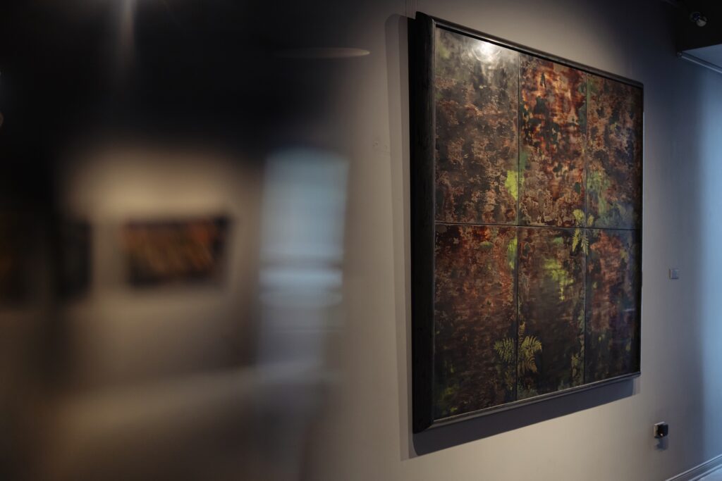 Ẩn dưới những lớp sơn mài ấy là một khu vườn không hoàn toàn thuộc về thế giới bên ngoài. Đó là một khu vườn nửa thực nửa mơ, nơi hàng trăm loài cây cỏ và sinh vật li ti náu mình dưới lớp rêu, nơi các mạch gạch, vết nứt dần hé lộ những trầm tích của thời gian. Quá trình “sơn” và “mài”, vốn là cốt lõi của sơn mài truyền thống, ở đây trở thành một phép ẩn dụ rõ rệt cho ký ức: mỗi lớp hiện ra đều mang theo dấu vết của những lớp đã mất, những gì bị che khuất nhưng chưa bao giờ biến mất hoàn toàn.