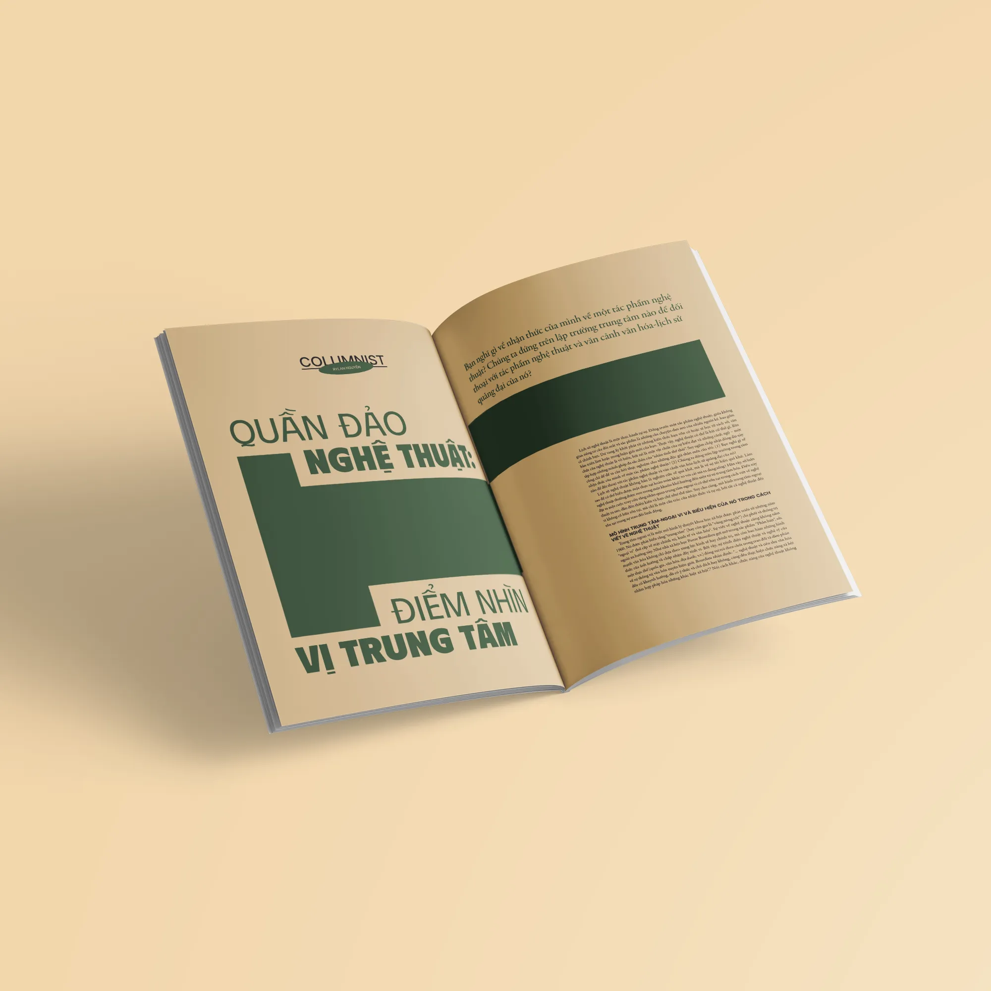 Đã là một tập quán, cột Columnist là diễn ngôn cho những học giả trẻ thể hiện quan điểm hàn lâm của mình: ngòi bút của Rylan Nguyễn (Ngoc Nguyen) kỳ này mổ xẻ về vấn đề của điểm nhìn vị trung tâm trong vận hành nghệ thuật cả trên thế giới và ở Việt Nam. Phóng chiếu ra khỏi Huế, “vị thế ở giữa” còn được ứng dụng cho cả Việt Nam khi chịu ảnh hưởng từ cả Á và Âu với lịch sử Bắc thuộc và Pháp thuộc. Điều này thể hiện rõ trong các bài lược sử thực vật họa của Phan Thị Thanh Nhã (Thanh Nhã Phan-Thị), nghiên cứu về dấu mộc trong gốm Biên Hòa của Nguyễn Ngọc Quý (Nguyen Ngoc Quy), và nhãn quan về một Viễn Đông xưa-nay qua lăng kính thực hành của Quang Lâm (Quang Lam). Lấy tác phẩm làm trọng tâm, độc giả sẽ được nhìn theo con mắt khoa học của chuyên gia bảo tồn nghệ thuật Vũ Đỗ (Vu Do) trong dự án bảo tồn sắc phong Việt, hay câu chuyện phục dựng 16 bức tranh Nguyễn Phan Chánh trong 15 năm qua của Mitani Foundation. Soi lại sứ mệnh vị nhân sinh của Ngân hàng Nhà nước, Tâm Phạm (Tâm Phạm) đã có một hành trình thú vị khi lật lại chuỗi minh họa cho bộ tiền tài chính của Việt Nam Dân chủ Cộng hòa. Khi những “trung điểm văn hóa” được lan rộng trong làn sóng toàn cầu hóa, chúng ta bắt buộc phải dịch chuyển tới những quy chuẩn vận hành quốc tế – đó là câu chuyện bản quyền Doraemon được ChuKim (ChuKim) thuật lại – và đồng thời phải suy ngẫm để bảo tồn những giá trị cục bộ và ngoại biên – một câu hỏi được An Tử đặt ra khi viết về văn hóa nhạc Chăm. Cuối cùng, độc giả sẽ được tham khảo một chiều kích liên ngành khi nhìn nhận những ảnh hưởng từ hội họa lên âm nhạc qua bài luận của Đức Minh và Anh Quân (Quân Trần).