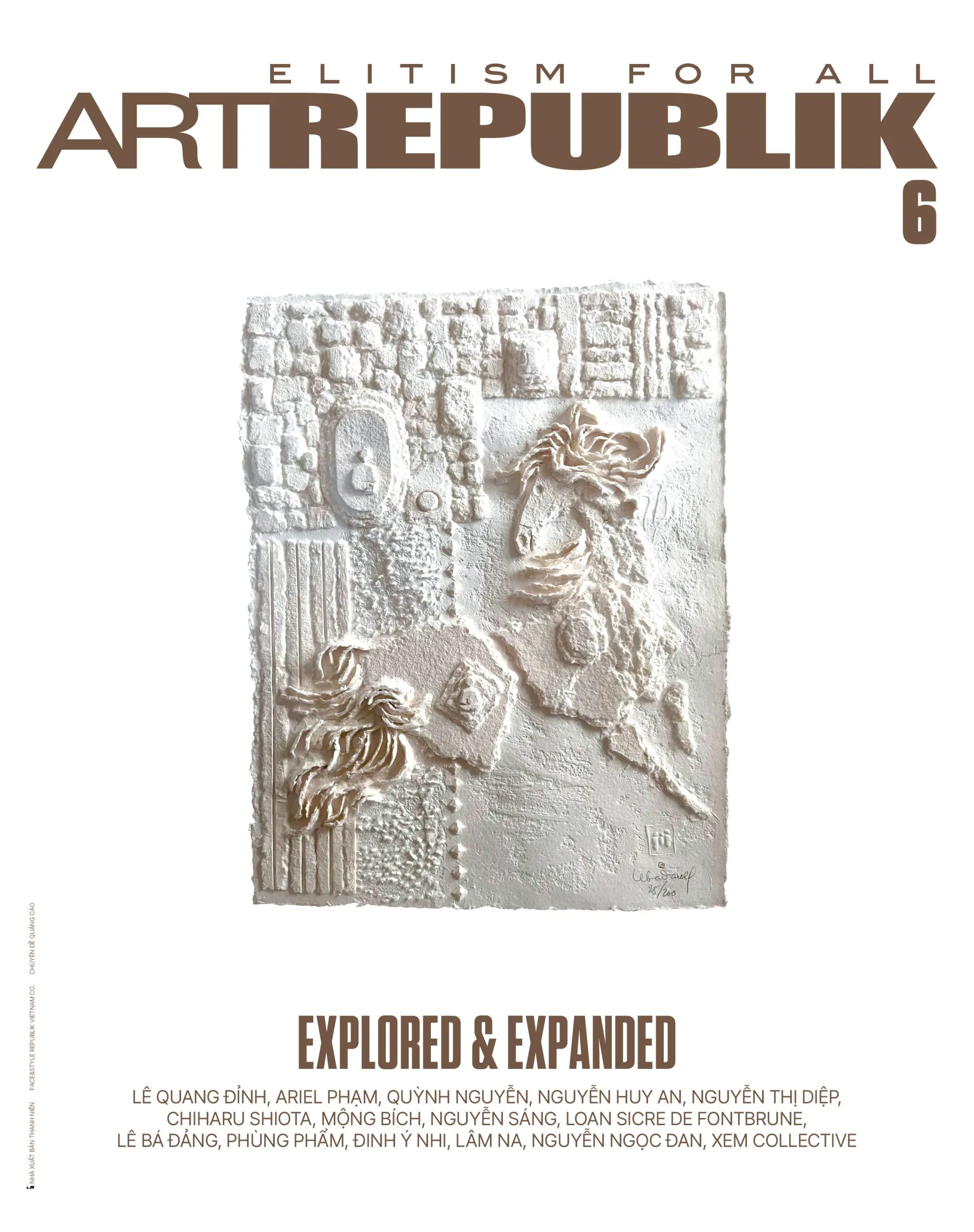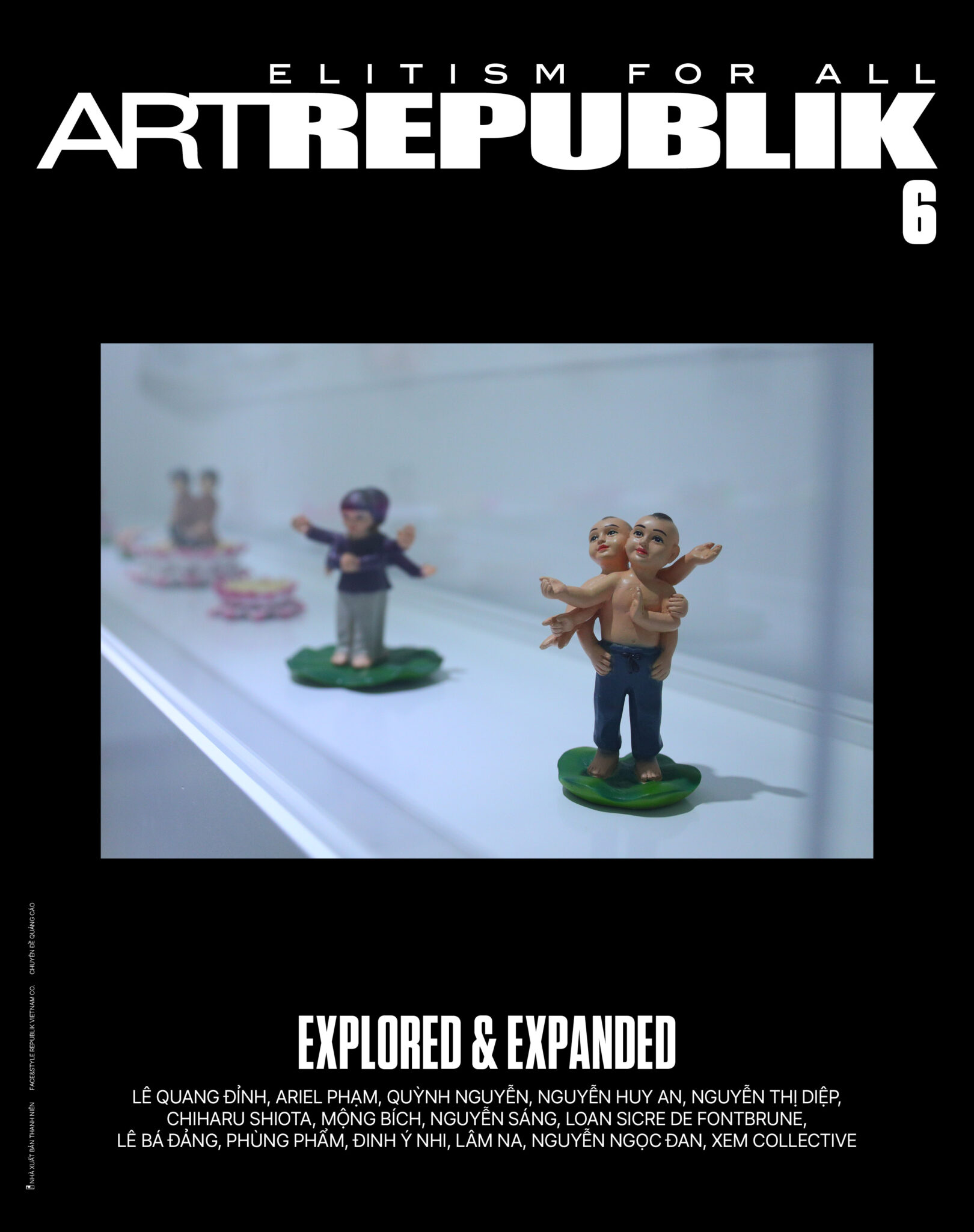 Với Chuyên đề mang tên “Vượt mọi ranh giới”, Art Republik kỳ 6 xem xét bối cảnh nghệ thuật đương đại dưới góc độ kinh tế với những khía cạnh đa dạng từ bảo trợ, sưu tập và đầu tư đến thương mại và tiếp thị. Bên cạnh giá trị thẩm mỹ, hoạt động kinh tế có sức ảnh hưởng mạnh mẽ tới “độ xiết” của dòng chảy nghệ thuật. Nhiều khúc quanh trong quá trình phát triển của nghệ thuật đương đại Việt Nam cũng như khu vực và quốc tế cho thấy rõ một điều: Để phát triển một cách bền vững, bản thân các nghệ sỹ và tổ chức nghệ thuật cần tự lực cả về tài chính lẫn nhân sự. Mỗi cá nhân và tổ chức, bằng tình cảm riêng dành cho nghệ thuật, bằng sự kiên định với trách nhiệm xã hội và cộng đồng, sẽ tìm được lối đi phù hợp để duy trì, phát triển và nhân rộng hình thái hoạt động của mình. Trong Chuyên đề kỳ này, chúng tôi được dịp ngồi lại cùng hai nhà sưu tập Quỳnh Nguyễn (Nguyễn Art Foundation) và Ariel Phạm (The Outpost), và cặp đôi nghệ sỹ Nguyễn Huy An – Nguyễn Thị Diệp. Đặc biệt ý nghĩa là cuộc trò chuyện cùng nghệ sỹ Lê Quang Đỉnh về hành trình hơn 15 năm cùng Sàn Art, một thành tố quan trọng trong dòng chảy nghệ thuật đương đại Việt Nam. Chúng tôi đã có cơ hội gặp gỡ anh chỉ vài tuần trước khi anh đột ngột qua đời. Xin trân trọng dành một phiên bản bìa đặc biệt giới thiệu tác phẩm của anh, bày tỏ sự tri ân tới những đóng góp của anh cho cộng đồng nghệ thuật Việt Nam.