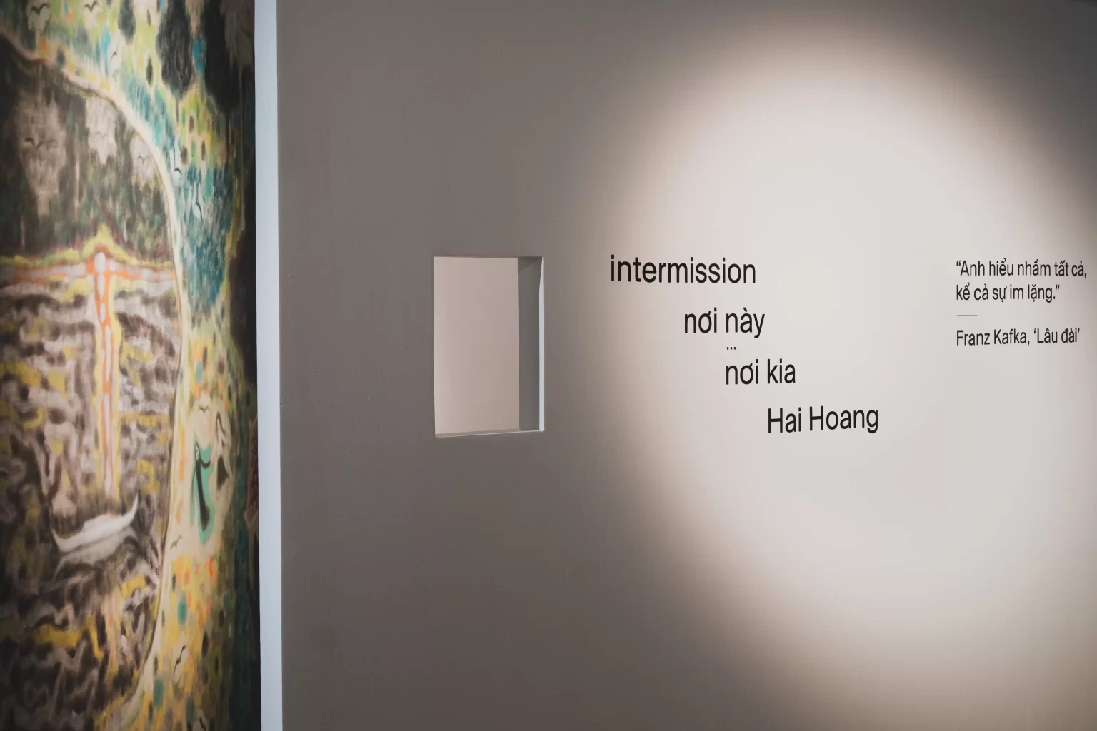 “Intermission – Nơi này…Nơi kia” trưng bày mười một bức toan đầy tính nội tâm, mỗi bức là một chốn trú ẩn được thiết kế để tôn vinh sự cô độc. Bằng cách khơi gợi trí tò mò của chúng ta, triển lãm dẫn dắt chúng ta bước qua những cánh cửa khép hờ, và theo một cách nhẹ nhàng hơn, nó mời gọi chúng ta hãy thả mình vào những khoảng giữa và ở lại đó. Bên trong Gate Gate Gallery, “Intermission – Nơi này…Nơi kia” đã biến hành động chiêm ngưỡng thành một quãng nghỉ hữu hình của thời gian.
