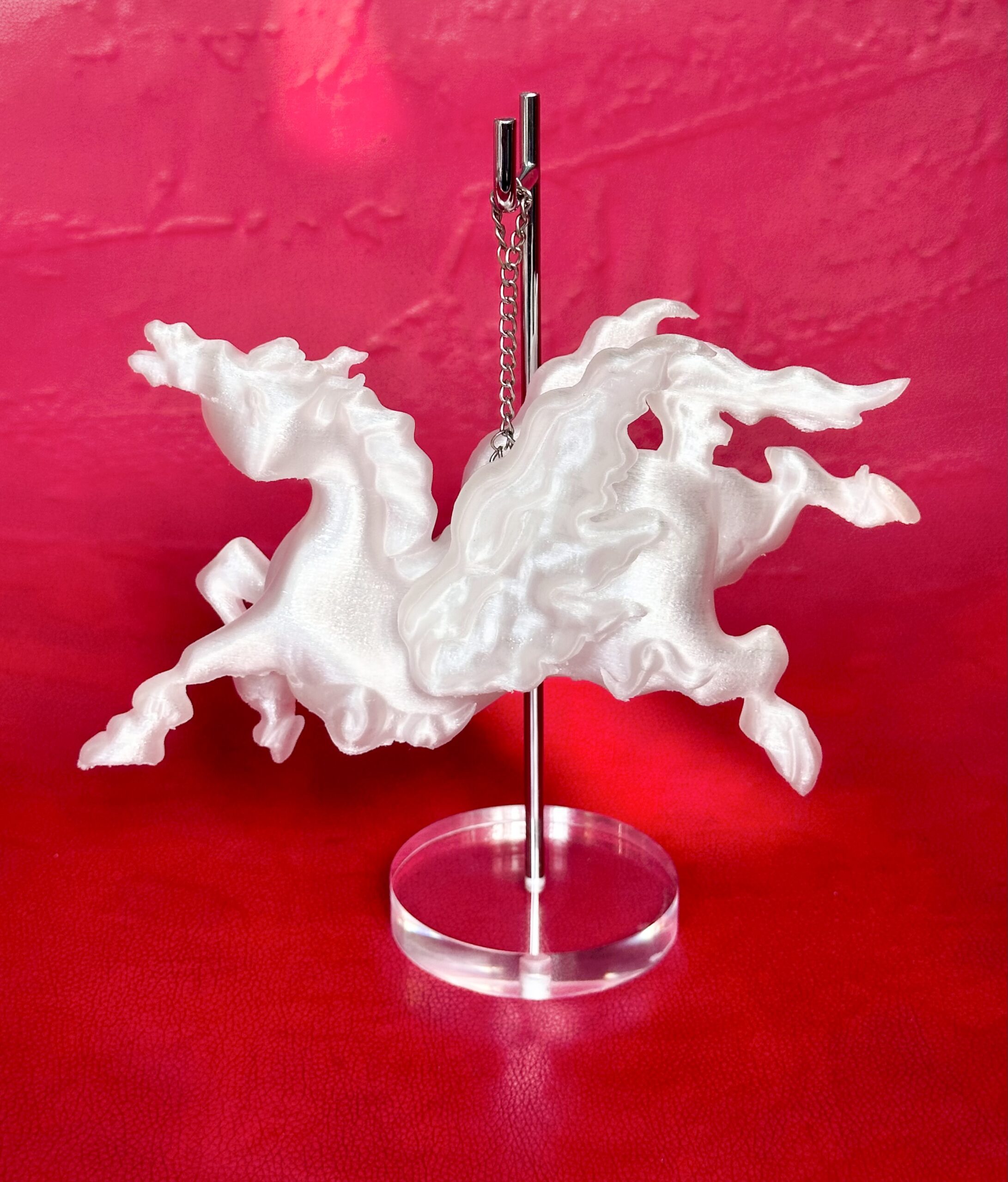 Nhờ đôi bàn tay của Phạm Xeen, chú ngựa có cánh từng bước chuyển mình khỏi một biểu tượng trong sứ hoa lam mà hòa chung vào dòng chảy hiện đại. Anh trước hết vẽ lại chú ngựa bằng nét bút của riêng mình, sau đó in kéo lụa, và cuối cùng là thử nghiệm với công nghệ in 3D sử dụng chất liệu nhựa sinh học. Qua mỗi lần tung cánh, chú ngựa trở nên gần gũi hơn, làm nhòe đi lầm tưởng ban đầu về đông – tây, hay sự ngăn cách xưa – nay. Vốn dĩ hình ảnh ngựa có cánh chỉ xuất hiện trên đĩa sứ kích thước lớn, hiếm có ai ngoài tầng lớp thượng lưu có thể chiêm ngưỡng, bởi dòng gốm Chu Đậu thường chỉ được triều đình xuất khẩu từ cuối thế kỷ XIV đến cuối đầu thế kỷ XVII. Vì vậy, chất liệu nhựa sinh học, vốn xuất phát từ ngô, đã xóa mờ đi lằn ranh của không – thời gian cùng giai cấp, để người Việt hiện đại hôm nay cũng có thể chiêm ngưỡng một hình tượng hàng trăm năm tuổi.