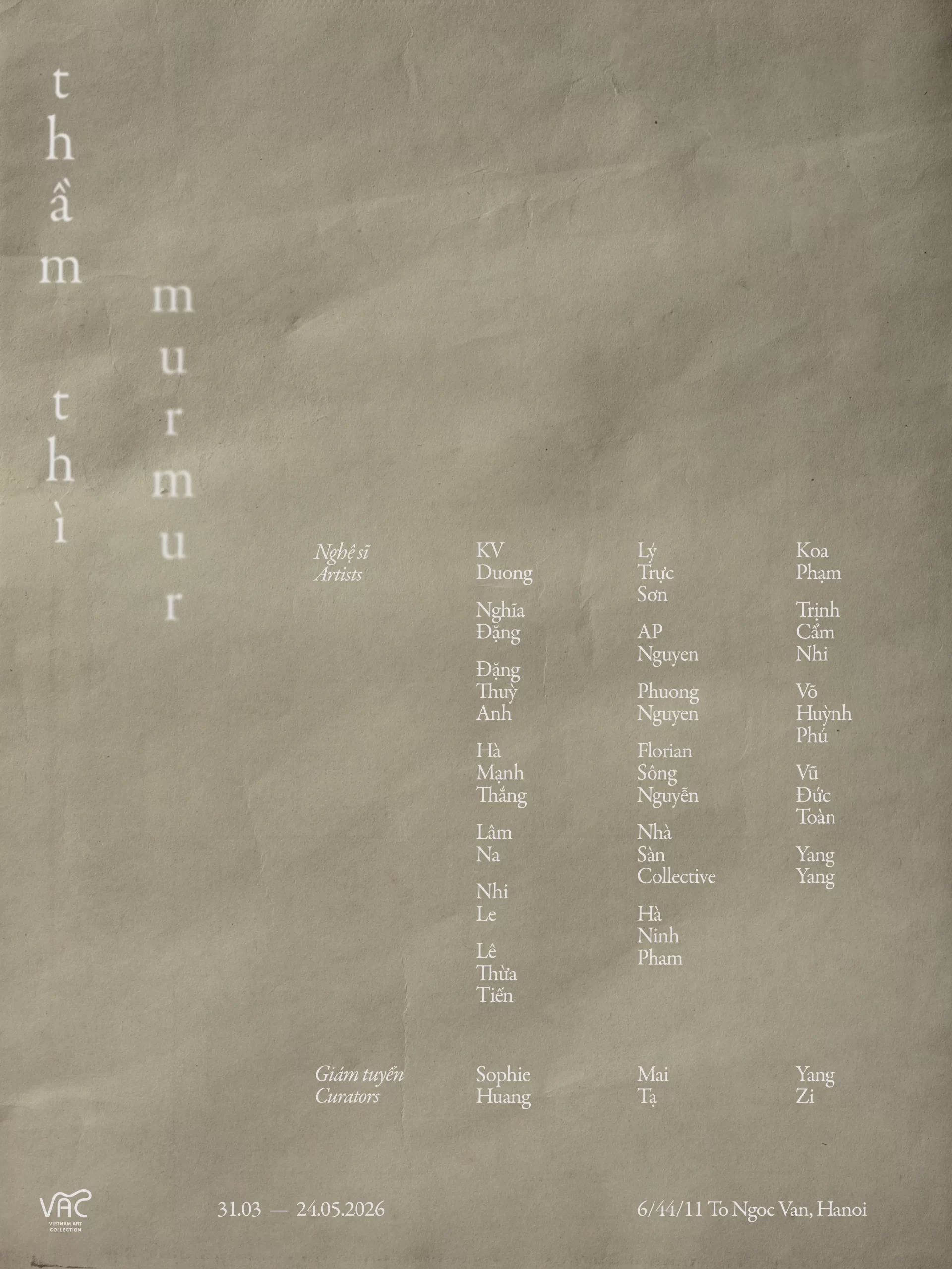 Triển lãm “thầm thì” là trưng bày kỷ niệm 3 năm của Vietnam Art Collection (VAC). Để đánh dấu cột mốc này, VAC giới thiệu trưng bày cùng với chuỗi chương trình cộng đồng như khai mạc và tọa đàm để mở rộng các cuộc trò chuyện về thực hành nghệ thuật, bối cảnh văn hóa và vận động của nghệ thuật đương đại Việt Nam.