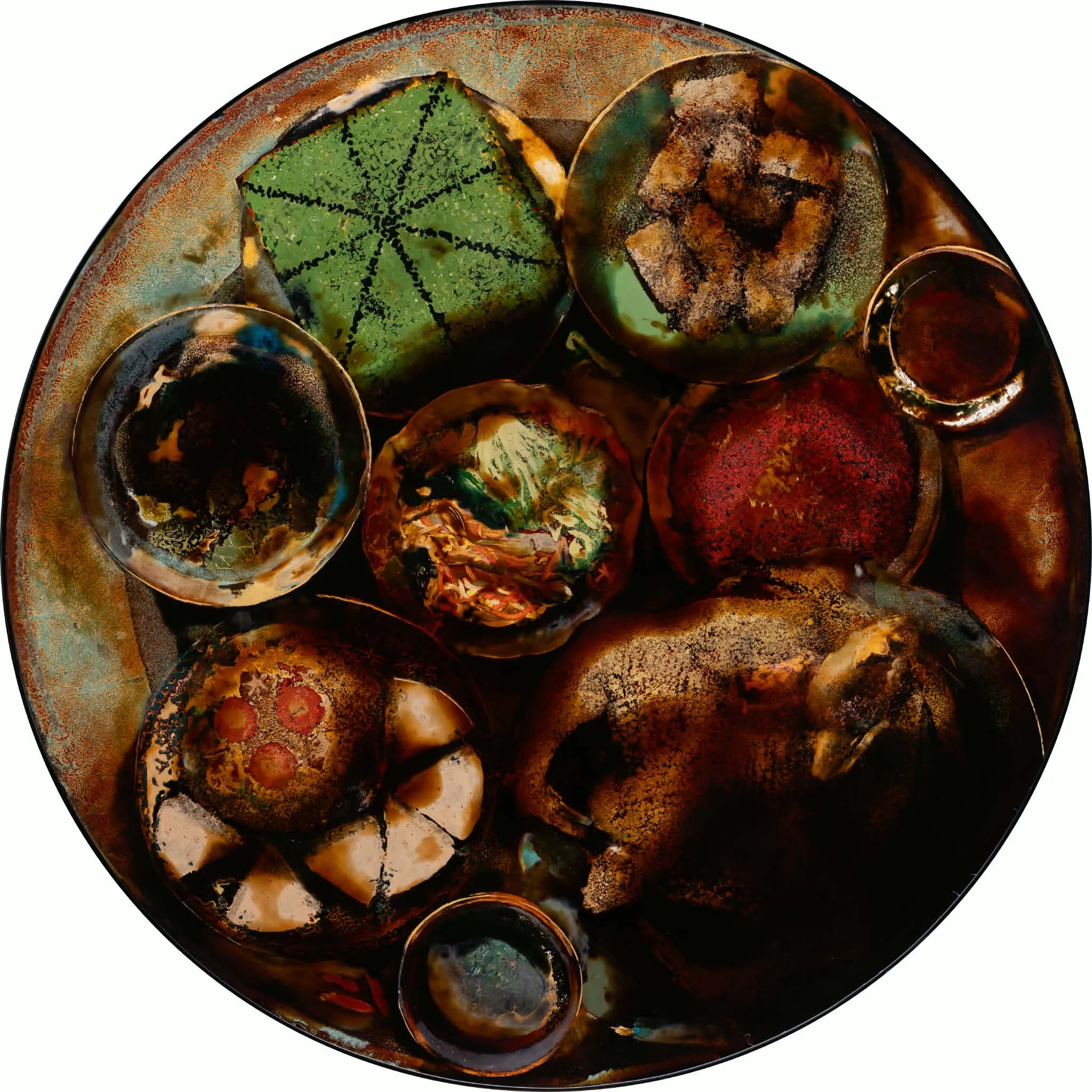 Phi Phi Oanh, “Hội hè miên man” (2026), sơn mài trên plastic, 60 x 60cm. Ảnh: Art30 Gallery.