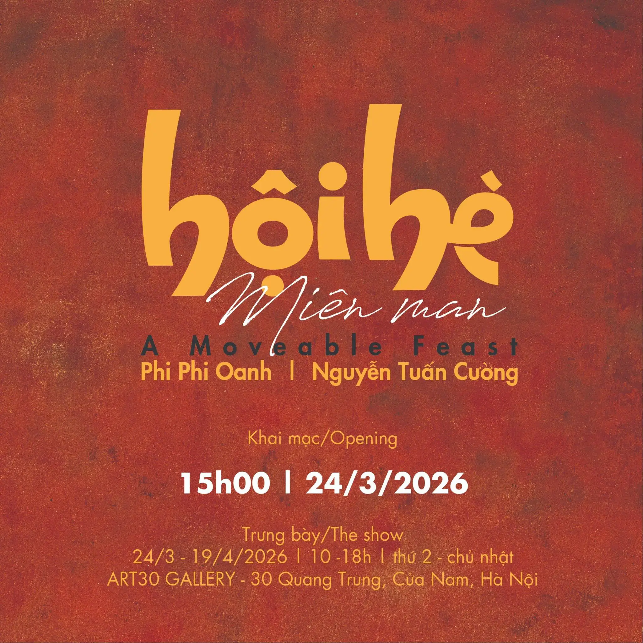 Art30 Gallery trân trọng giới thiệu triển lãm nhóm “Hội hè miên man” của họa sỹ Phi Phi Oanh và Nguyễn Tuấn Cường. Mượn tiêu đề cuốn hồi ký của Hemingway để ám tả về sức sống của một chất liệu nghệ thuật, “Hội Hè Miên Man” là triển lãm sơn mài trong dòng chảy hội họa truyền thống của người Việt. Triển lãm này được gợi ý từ một phẩm chất của sơn mài: trong những khoảng bóng nửa tối của các lớp sơn phủ, hình ảnh sẽ luôn dao động giữa sự xuất hiện và sự lẩn khuất. Đặc tính này khiến sơn mài trở thành một không gian mang nghịch lý thị giác, nơi ánh sáng và bóng tối luôn đồng hiện. Thực hành của hai họa sỹ, Phi Phi Oanh và Nguyễn Tuấn Cường, khi đặt cạnh nhau, sẽ cho thấy hai hướng tiếp cận rất khác nhau mà hội họa sơn mài có thể mở ra trong nghệ thuật đương đại. Một Phi Phi Oanh chi tiết hiện thực và một Nguyễn Tuấn Cường ca tụng bóng tối.
