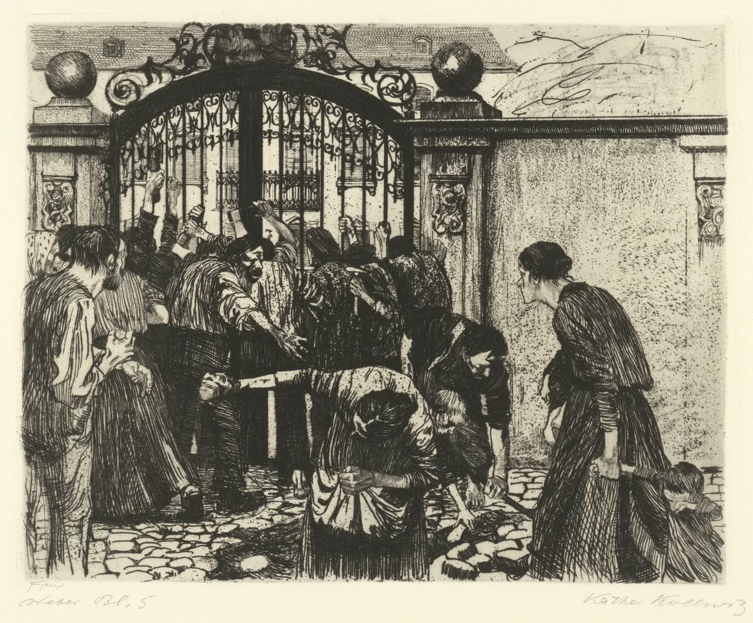 Nghệ thuật cũng là nhân chứng của khổ đau và áp bức. Käthe Kollwitz (1867–1945), nghệ sĩ người Đức, đã ghi lại nỗi đau và sự mất mát của những người dân lao động và những người mẹ trong chiến tranh. Tác phẩm của bà, chủ yếu là tranh khắc gỗ và đồ họa, không tô vẽ chiến tranh như một điều vinh quang mà khắc họa nó như một thảm họa đối với con người. Bà không chỉ là một nghệ sĩ mà còn là một nhà hoạt động xã hội, đấu tranh cho quyền của phụ nữ, người nghèo, và lên án sự phi nghĩa của chiến tranh. Loạt tác phẩm của bà, như Cuộc nổi dậy của thợ dệt (Weavers’ Revolt) và Chiến tranh (War), là lời tố cáo mạnh mẽ về sự tàn bạo của hệ thống xã hội đương thời.