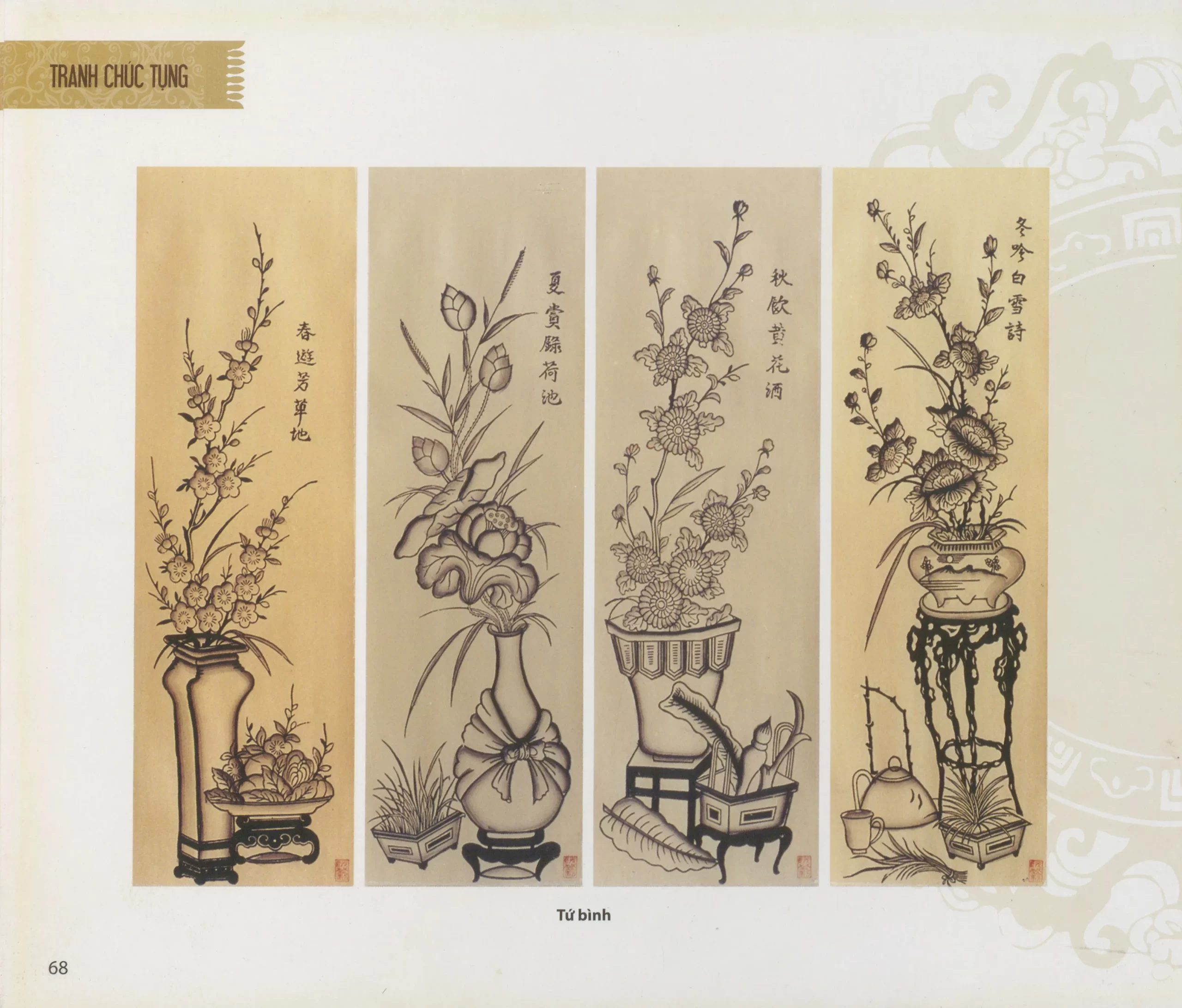 The Flowers of Four Seasons paintings, part of the New Year greetings theme from Dong Ho folk paintings. Source: “The Craft of Dong Ho Folk Paintings: A Cultural Heritage of Vietnam” (2014) by Vu An Chuong and Nguyen Dang Che.