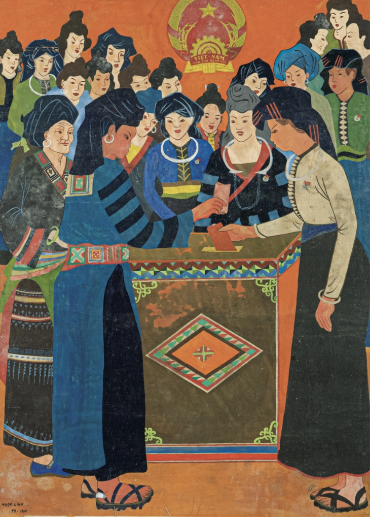 Our class was skilled at both sketching and making propaganda posters. During the war, we would travel to markets in Lao Cai and Yen Bai to exhibit our works for the local communities. The posters encouraged farming, joining movements, paying taxes and donating rice to the government – all to explain the government’s policy of temporarily loaning the spring harvest.[1] Villagers came in large numbers to see our works. In late 1951, our entire class traveled to Lao Cai and Yen Bai to paint and prepare for a fine arts exhibition. Artists like Quang Phong, Duong Bich Lien and Nguyen Sang also joined – they hadn’t finished their studies when the Revolution broke out, so they came to meet To Ngoc Van to take their graduation exams. The exhibition featured works by Phan Thong, Nguyen Quoc An and many others. The response was overwhelming; the atmosphere was solemn. I submitted a painting depicting people carrying rice for tax contributions. It was a special day – Deputy Prime Minister Pham Van Dong, Education Minister Nguyen Van Huyen and Acting Interior Minister Phan Ke Toai also attended. President Ho Chi Minh even sent a congratulatory letter encouraging the artists and congratulating the exhibition. After the war, the Resistance Class held four exhibitions. I helped organise every single one. The 1954 show was at the Exhibition House on Trang Tien Street. The next two were at No. 16 Ngo Quyen Street. For the last one in 1993, I secured funding from the Sweden–Vietnam Cultural Development Fund on Tran Hung Dao Street to print a catalog at Tien Bo Printing House.
