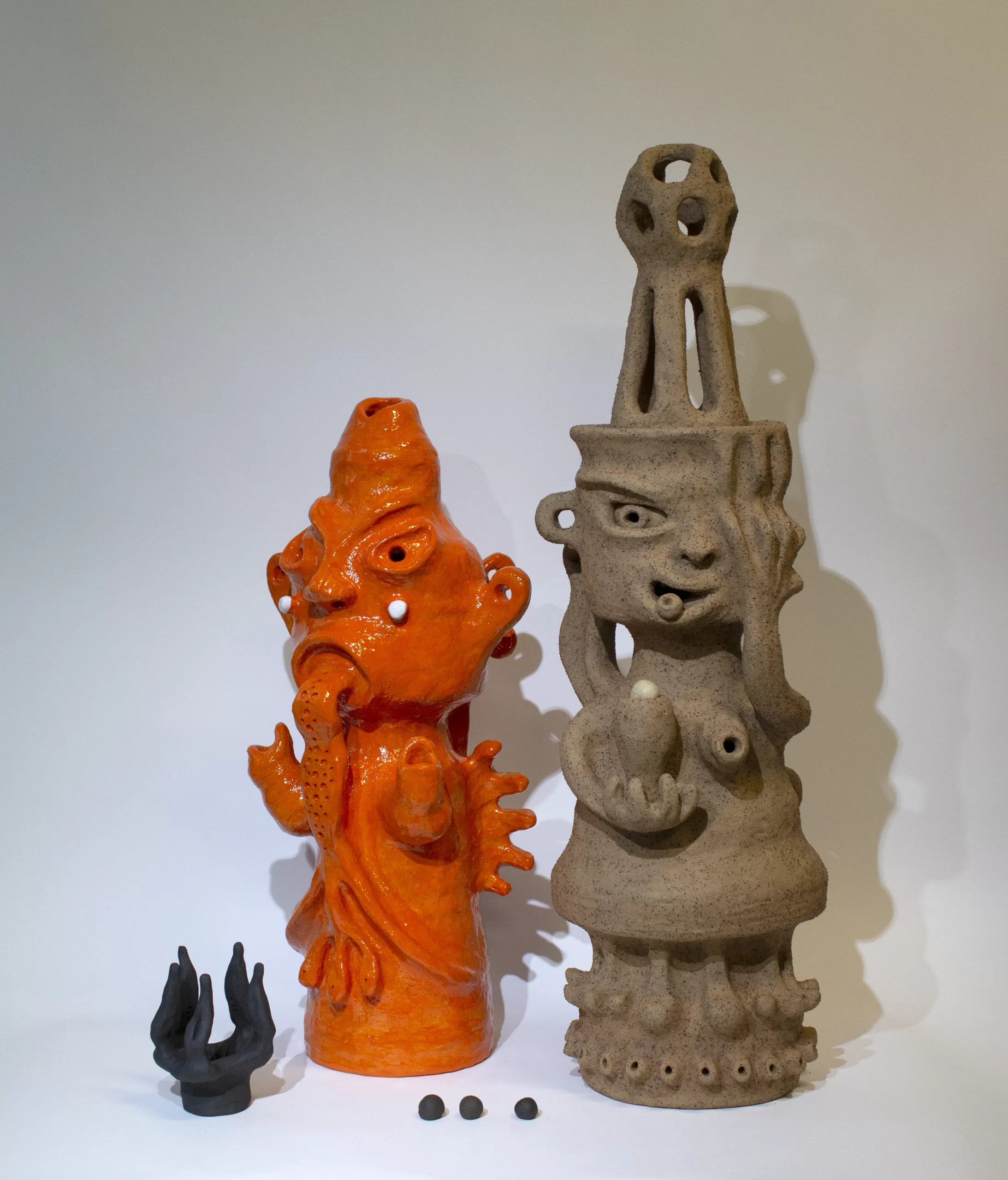 “Vomit Girl” first emerged in the artist’s paintings and drawings as a visceral response to her experience of rejection, signifying not only voicelessness and silencing, but also resistance and a means of healing and reconnecting through humour, wordplay and creative mis-translation. In developing this body of work, Mai returned to Vietnam in 2014, the first time in over a decade, and a year later started working with clay in Bat Trang. She describes her rustic village-associated aesthetics as “moc mac” – an earthy embrace of imperfection in all its manifestations. As a means of reclaiming her cultural heritage, Mai also pursued her interest in Vietnamese folklore and a fascination with the little-known wooden “dinh” (communal house) carvings that decorate local village halls that she first encountered in the 1990s.