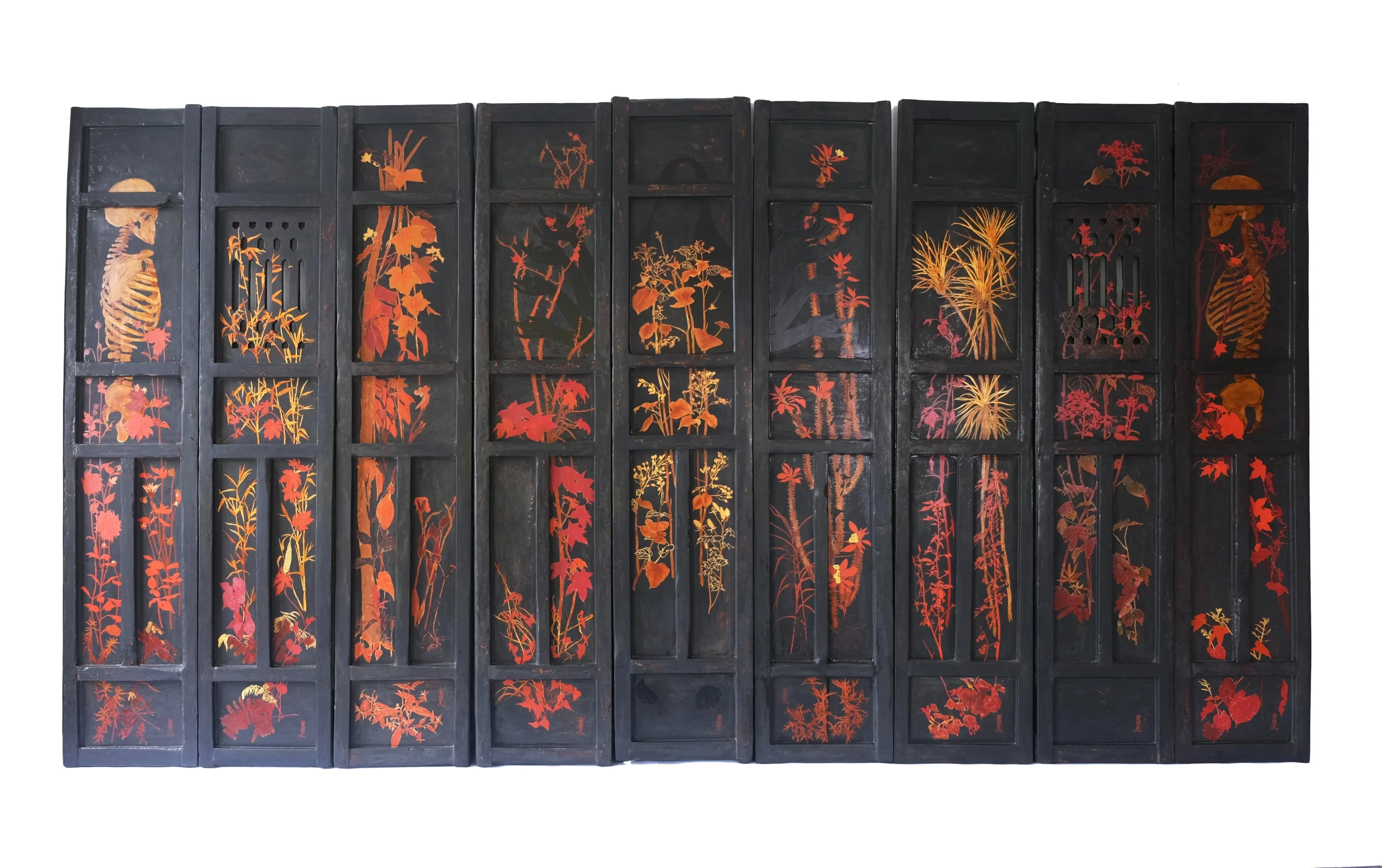 Forming a single wall of the house, each side of the doors offers a counterpoint to the other. One surface bears imagery of war, death and catastrophe, while the other presents scenes of dreams, landscapes and hope. Together, they embody a tension between destruction and renewal, opening and closure. The trees, flowers and animals depicted carry symbolic weight: for example, some plants are medicinal and are associated with healing, yet others are toxic and life-threatening. At the centre of the nine assembled panels, Le Thuy painted a single shadowy female figure with multiple arms, representing the nurturing and protective aspects of the Vietnamese Mother Goddess Worship that has syncretically merged with the worship of the Buddhist bodhisattva Guanyin.