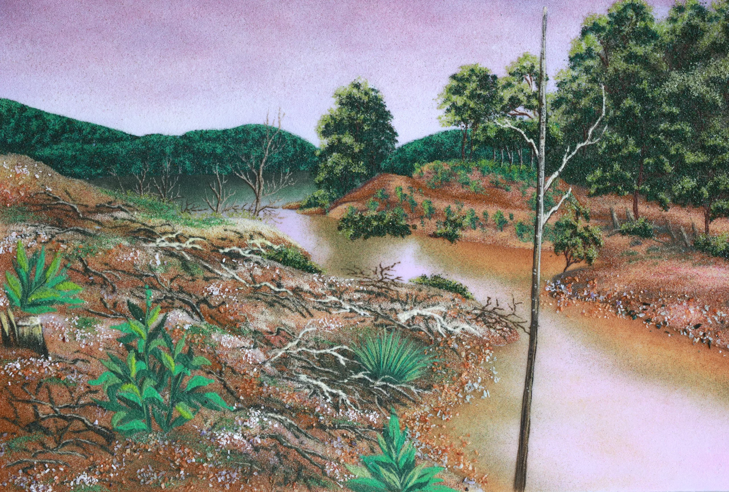 Le Giang’s series of gem paintings, titled after this genre, points to the irony in such cultural perceptions of the natural world. Gem mining has led to erosion, the pollution of lakes and the deforestation of areas considered sacred in local spiritual practices. Some of her gem paintings appear abstract, replicating the surface of the cut gemstones to imply the process of their extraction in the gouging of the Earth. Departing from the distant, awe-inspiring view of a sublime nature, these works use an intimate lens to reveal flaws and fissures. Contrasting with these is a series of representational landscapes that depicts areas ravaged by open extraction mining and pollution. Initially enchanting, with their shimmering surfaces and seductive colours, on closer inspection it becomes apparent that the trees are sickly, barren of leaves; weeds flourish while erosion is widespread. The landscape is suffering. Through this tension, Giang exposes the dissonance between the pristine images of towering mountains and flowing rivers and the darker environmental, social and economic realities that they obscure.