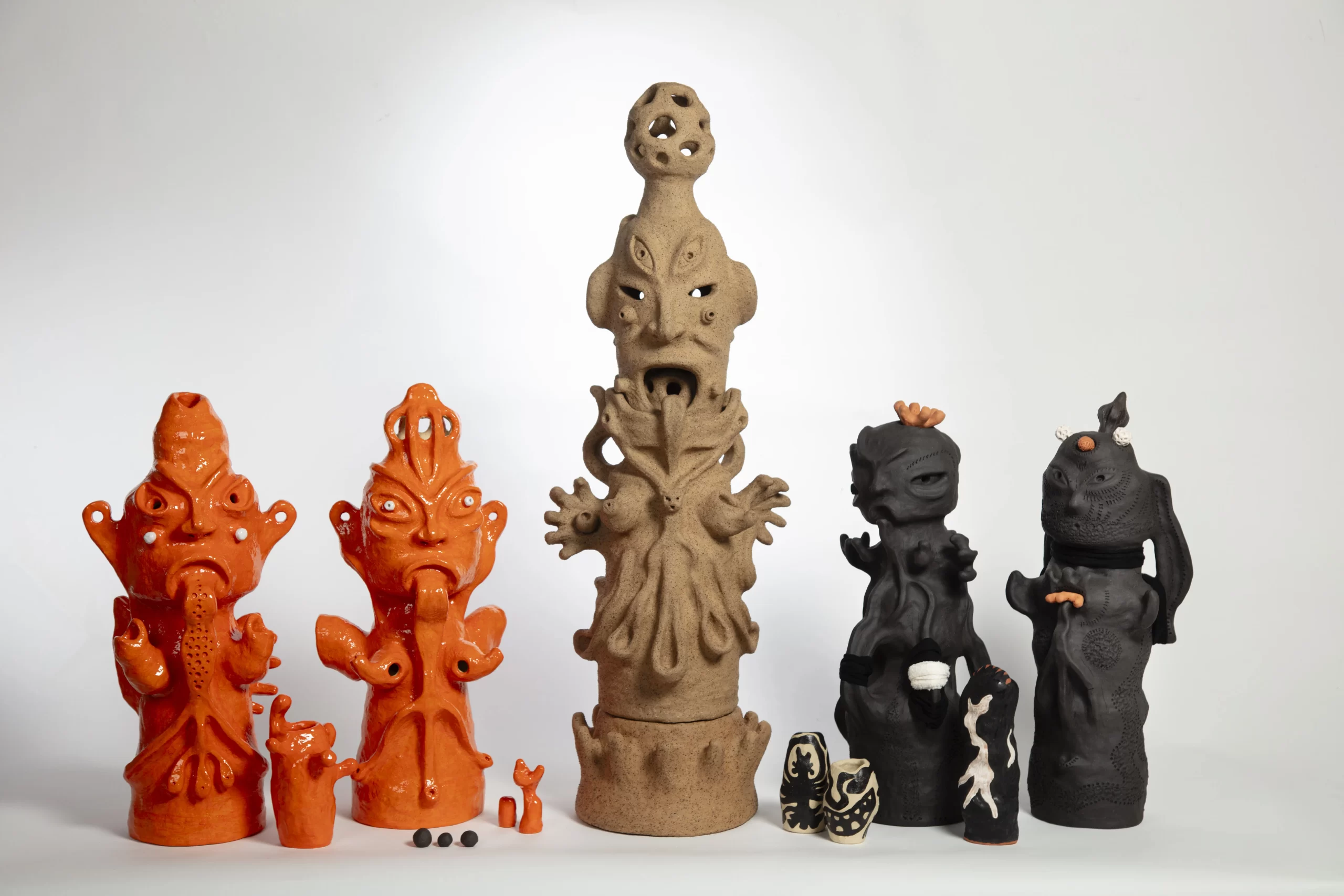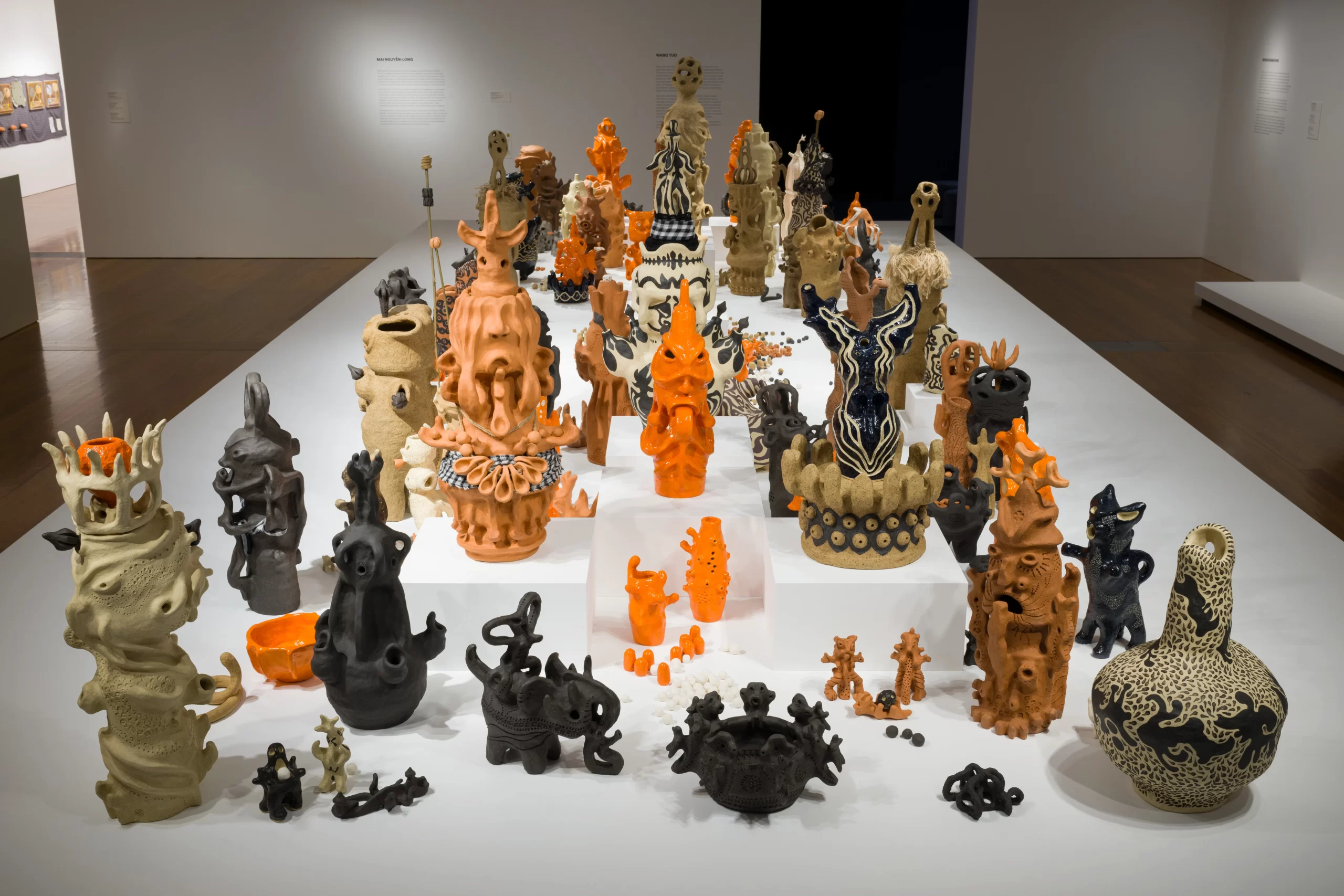 Mai regards her “Vomit Girl” ceramic sculptures as “contemporary folkloric forms” and proposes that “contemporary art can draw from folkloric strategies to open up spaces for suppressed, hidden, and new stories to emerge beyond diasporic trauma.” The basis for the body of every “Vomit Girl” is the “Doba” (“dinh” bombshell bell axis) form, a reference to a real bombshell that had been repurposed as a village bell, a gesture of hope and resilience. Elephant fairies, toads, warrior cats, dancing birds, buffalo riders, mudskippers and screaming chickens are some of the captivating forms that emerge to create a refined, systematic and deeply engaging visual language. “The Vomit Girl Project” (2024), shown at APT11, includes many new works from small objects that can be held in the palm of the hand to multi-part figures more than one metre tall, created specifically for the Triennial. Through the medium of clay, Mai forges new connections and associations as a form of decolonisation and creative resistance.