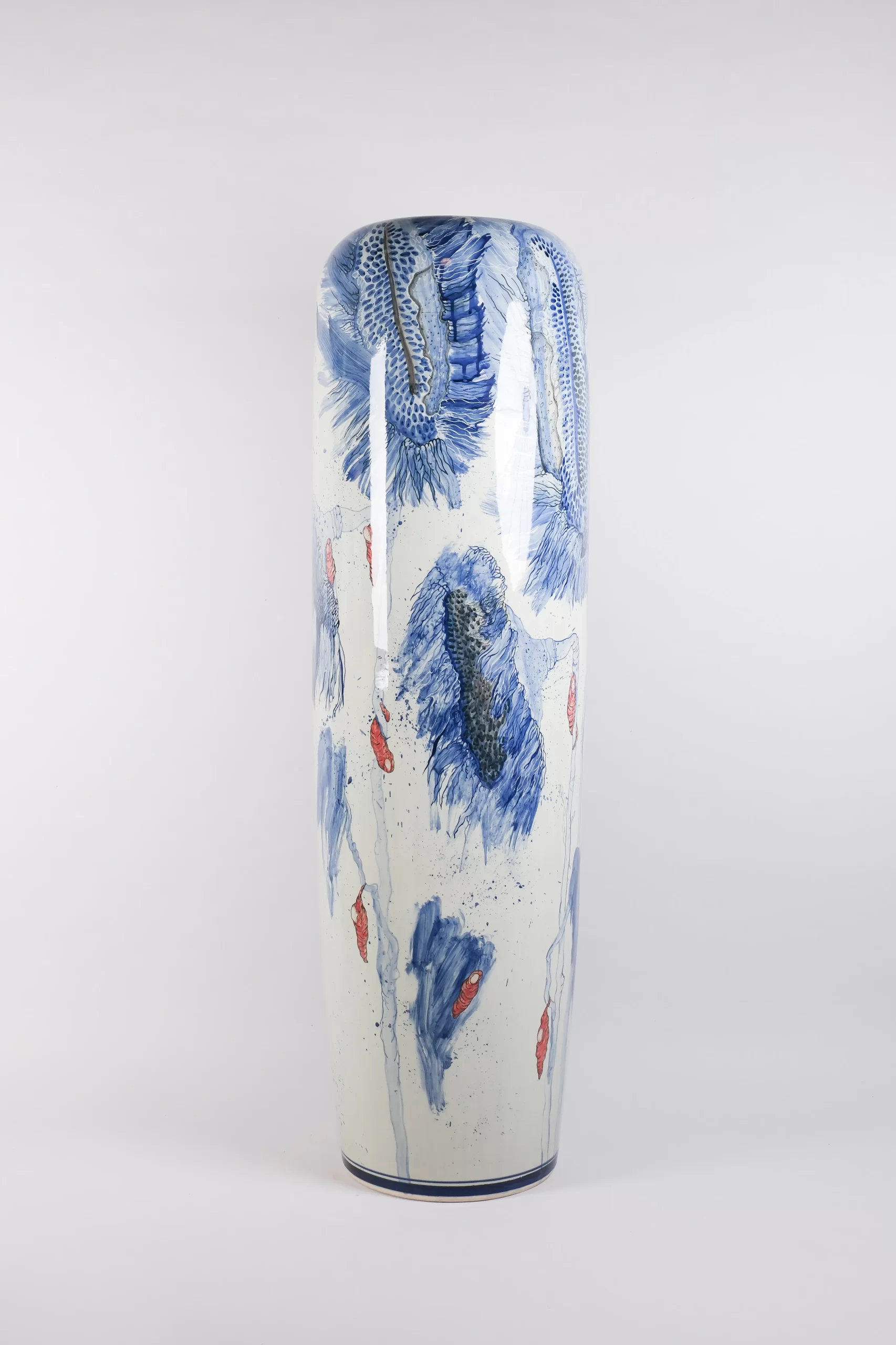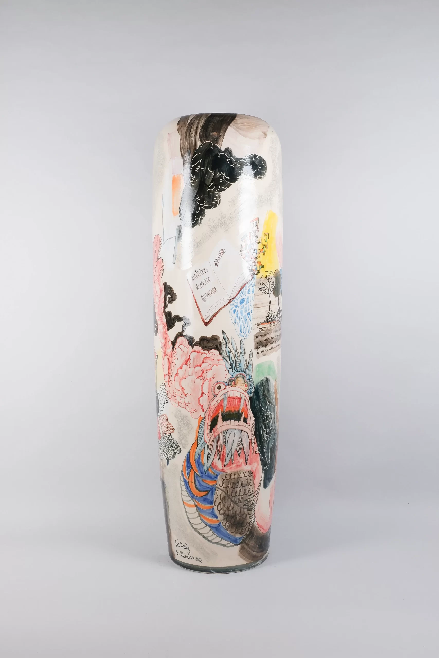 Ever since, the artist has continued to refine his techniques, which result in remarkable bodies of work that are varied in scale, concept and expression. As part of his representation in APT11, Khanh exhibited a group of vases made between 2022 and 2023 alongside a new video work made in Bat Trang. Standing approximately 1.5 metres tall, each of the five vases has a distinctive curved shape and rounded top intended to resemble a bomb. Some display the beautiful ivory-white crackle glaze characteristic of Bat Trang, while others have a glossy finish. Hand-painted dragons, cityscapes, smoke, clouds, colourful human figures, drooping cobalt sunflowers and chrysalis-like human forms adorn them.