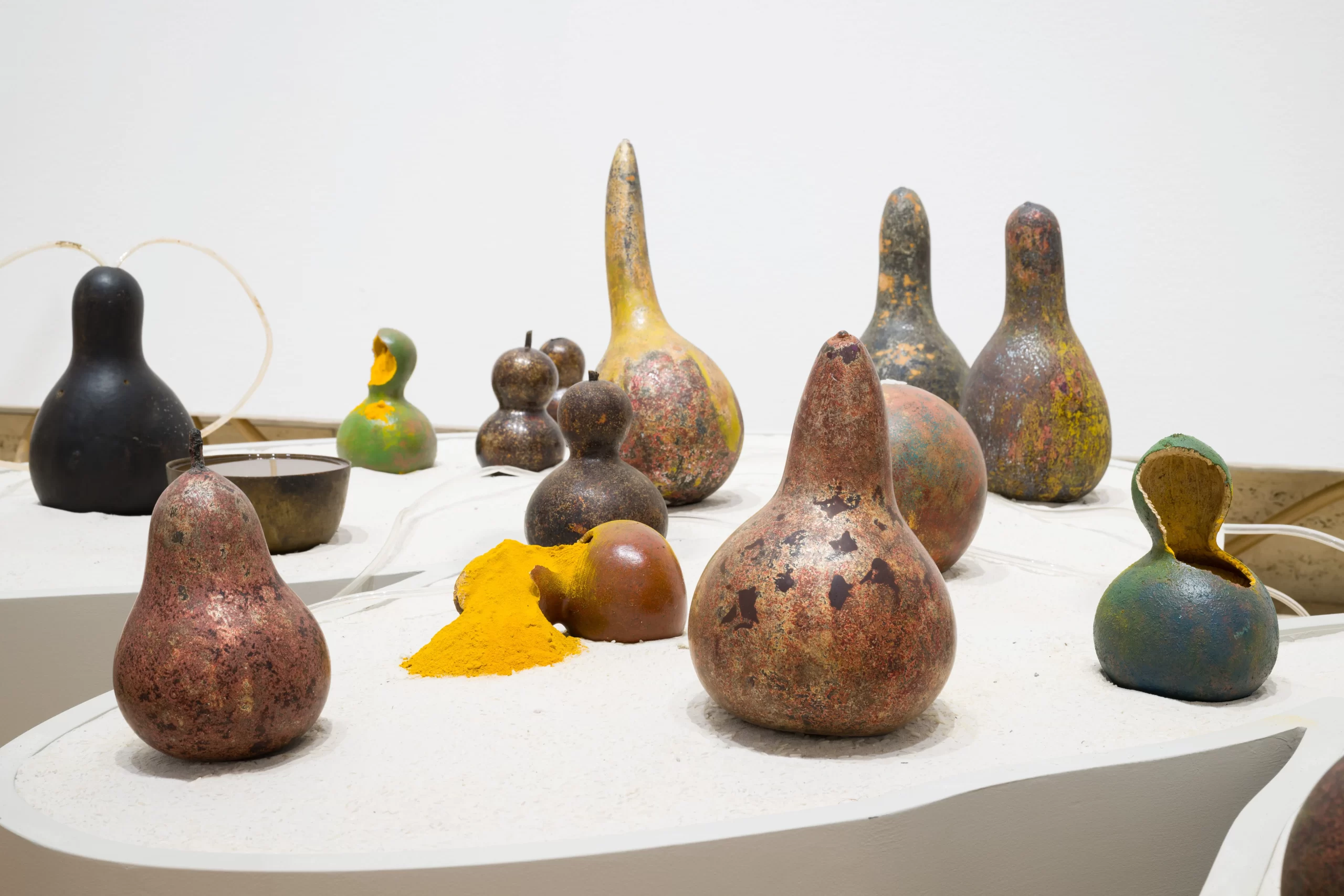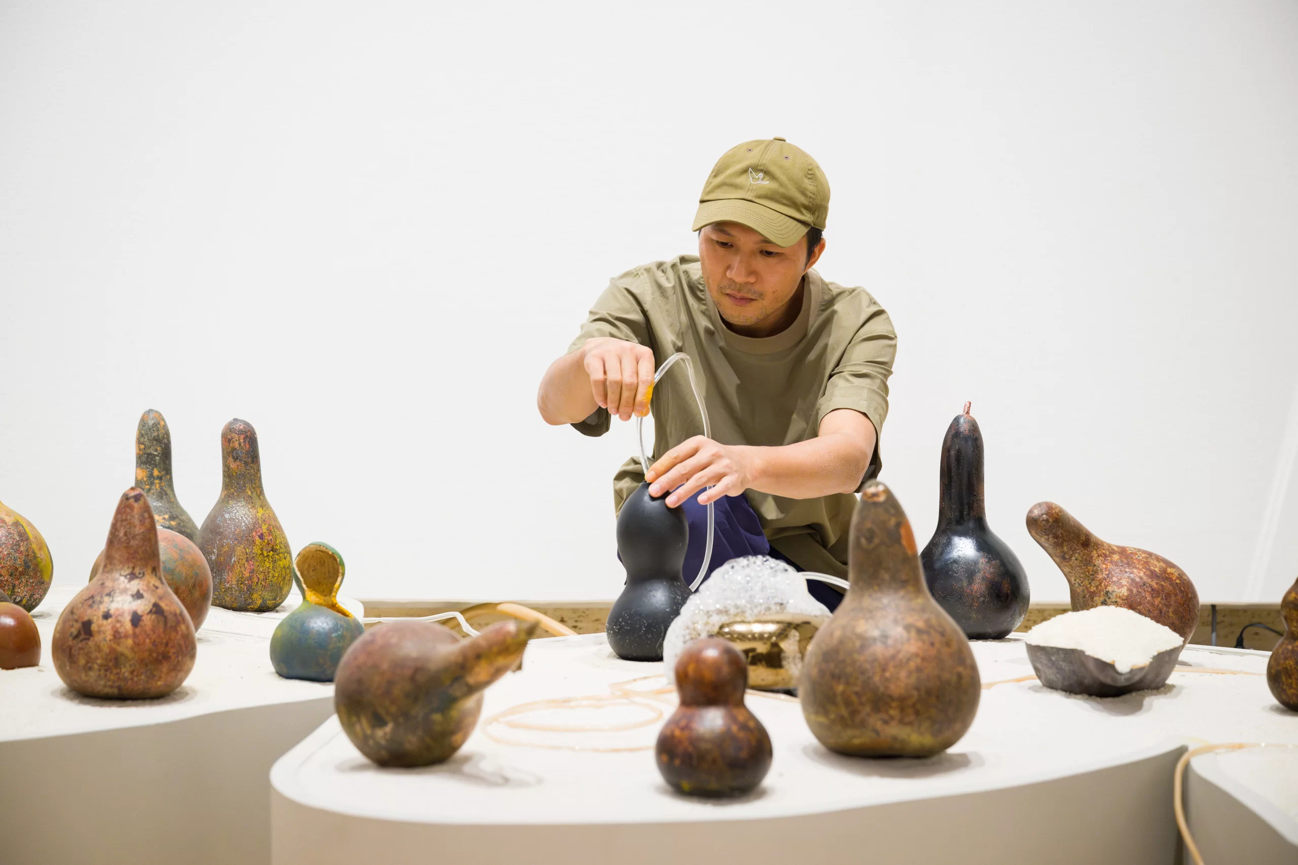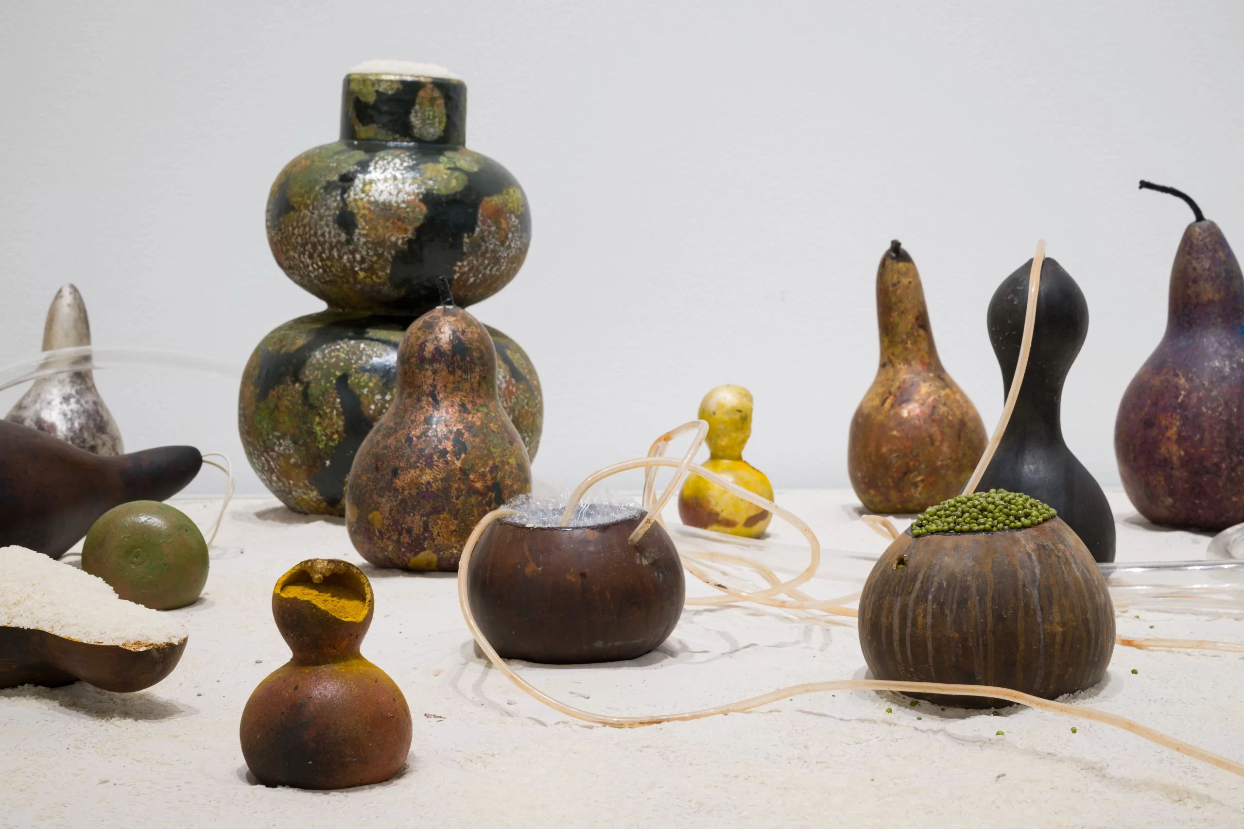 Tung travelled to Brisbane in 2024 with his assistant and brother, Tu, to install his work onsite. Together, they arranged lacquered gourds across beds of sand, connecting them to an arterial network of plastic tubing that fed into a pond of ink-darkened water. Various gourds held distinct materials: turmeric for its scent and vibrant hue; tiny green mung beans, which quickly sprouted; rice, meticulously swept into place with a wide brush; red kidney beans, added for their weight; and dishwashing liquid, replenished daily to generate frothing mounds of kinetic bubbles. Motion sensors triggered speakers that emitted the ambient hum of insects – bees, cicadas and others – adding an aural layer to the installation’s sensory landscape.