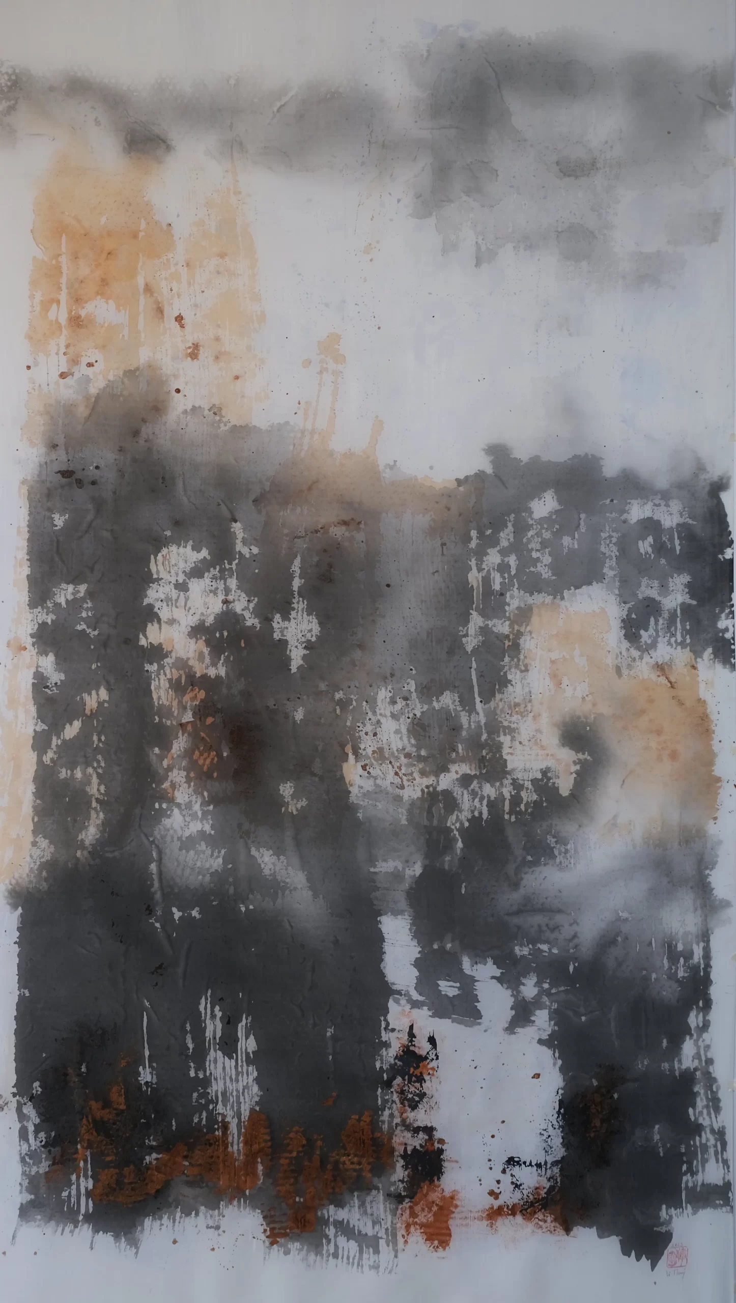 Le Thuy, “Echo” (2023), ink, calligraphy, synthetic polymer paint, and embroidery on silk, 220 x 112 cm. Purchased 2024 with funds from Tim Fairfax AC through the QAGOMA Foundation. Collection: QAGOMA Foundation.