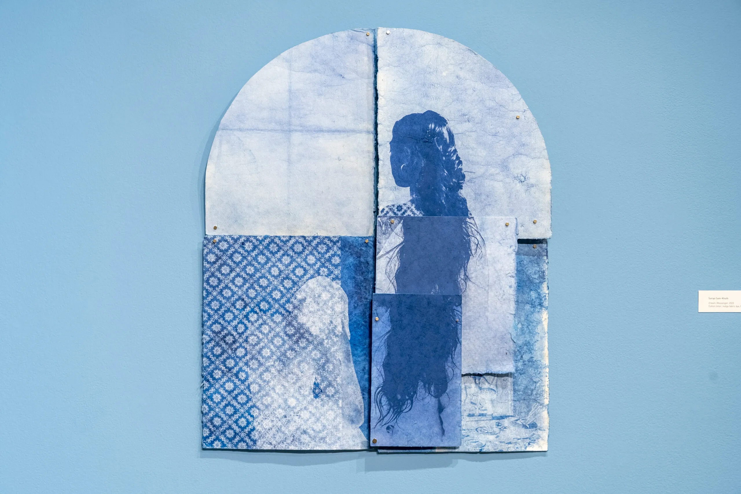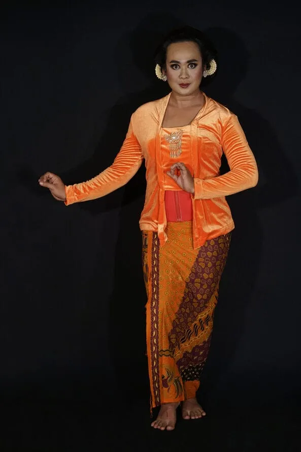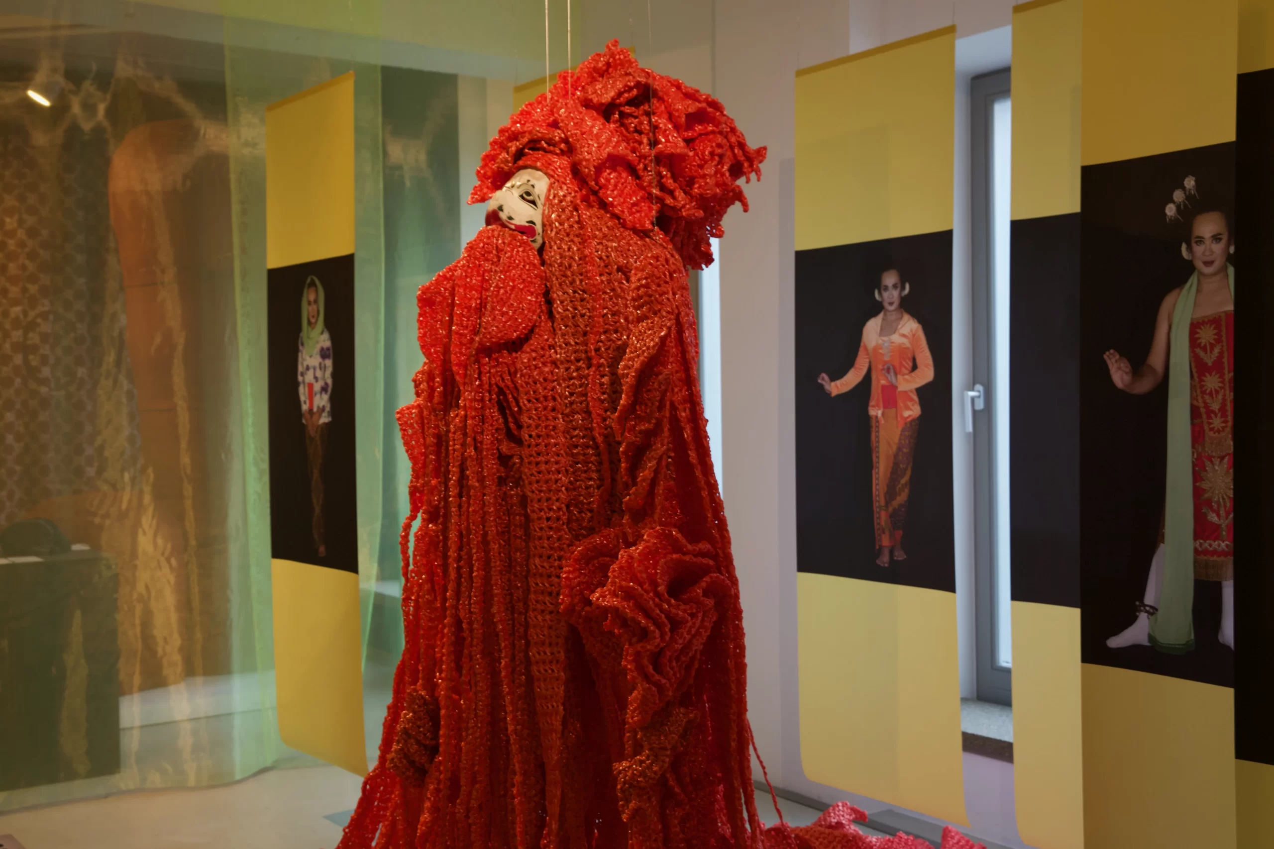 The exhibition reminds us that gender diversity and queer ways of life in Southeast Asia are not recent imports from the West; in fact, they have long existed in the region. “Ancestral Knowledge” delves into how queer histories and heritages are retold through contemporary perspectives. Indonesian artist Tamarra (Yogyakarta) presents “Bongkar Pasang (Overhaul)” (2024), an impressive large-scale textile sculpture made of crocheted raffia (plastic rope). Originally introduced through a performance, the piece embodies an exploration of gender identity in response to shifting social landscapes. Tamarra later expanded this work by engaging with non-binary histories in Indonesian performance art, particularly Ludruk, a folk theater tradition from East Java that is historically performed exclusively by men, including in female roles, and known for its anti-colonial themes. In the self-portrait series “Uri-uri Ludruk” (“Preserving Ludruk”), Tamarra embodies a range of characters that highlight the enduring presence of cross-gender expressions in both performance and daily life, tracing their lineage back to Indonesia’s pre-colonial past.
