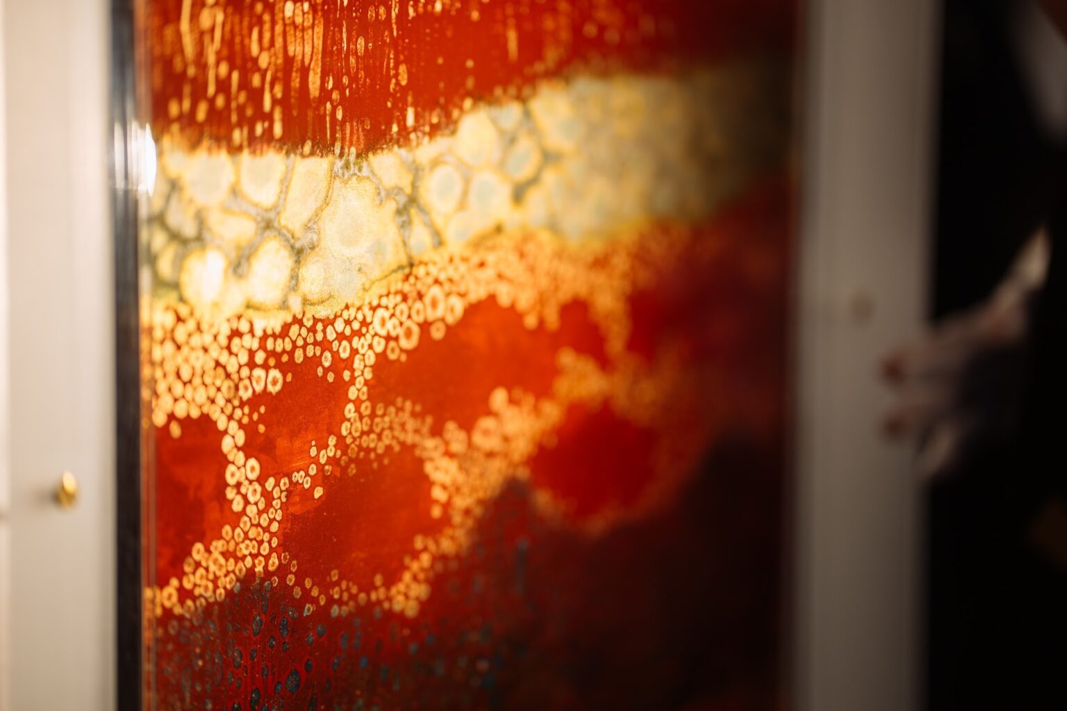 Điểm đặc biệt của buổi trò chuyện tại tamminh-light là sự đồng hiện giữa nghệ thuật và ánh sáng. Showroom trở thành “phòng thí nghiệm cảm xúc”, nơi khán giả có thể trực tiếp trải nghiệm sự biến đổi kỳ diệu của sơn ta dưới các điều kiện ánh sáng khác nhau. Khi ánh sáng tự nhiên mờ dần, và những dải sáng nhân tạo của tamminh-light lan tỏa trên bề mặt tranh, mỗi lớp sơn bắt đầu kể một câu chuyện khác. Ánh sáng xuyên qua chất liệu, phản chiếu, thậm chí hé lộ những hình ảnh ẩn sâu mà mắt thường khó thấy – như một biểu tượng cho chính hành trình của Saeko: từ lặng im tới rực rỡ.