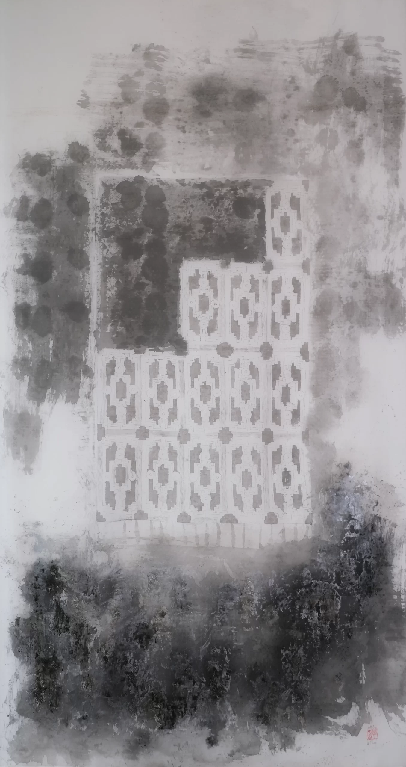 Ở phía đối diện là bức vách từ chuỗi tranh vẽ mực trên lụa. Những nét vẽ khi phóng khoáng, khi tỉ mỉ, những áng thơ và đường chỉ thêu tay cùng tái hiện hình bóng những khám thờ gia tộc, những hoa văn kiến trúc xưa, những kỷ vật đầy trân quý. Đây là những vật thể gợi bóng dáng cố nhân, hé mở những hình dung về giá trị sống, đức tin và ước vọng thầm kín của họ. Kề bên, cụm gạch vỡ phủ sơn mài và thếp vàng trở thành điểm tựa cho toàn bộ sắp đặt. Những tàn tích hữu hình ấy đối hưởng với bức tường gạch hiện lên trong tranh, hình thành một đối trọng về chất liệu với vẻ thanh tao của lụa. Tính phù du của ký ức và mong manh của di sản là tâm điểm “Tiếng vọng”. Như chính lời nghệ sỹ chiêm nghiệm, “Tôi hy vọng rằng, qua khám phá này, chúng ta có thể phát hiện vẻ đẹp trong những điều khuất lấp và ý nghĩa nơi những gì đã phai mờ.”