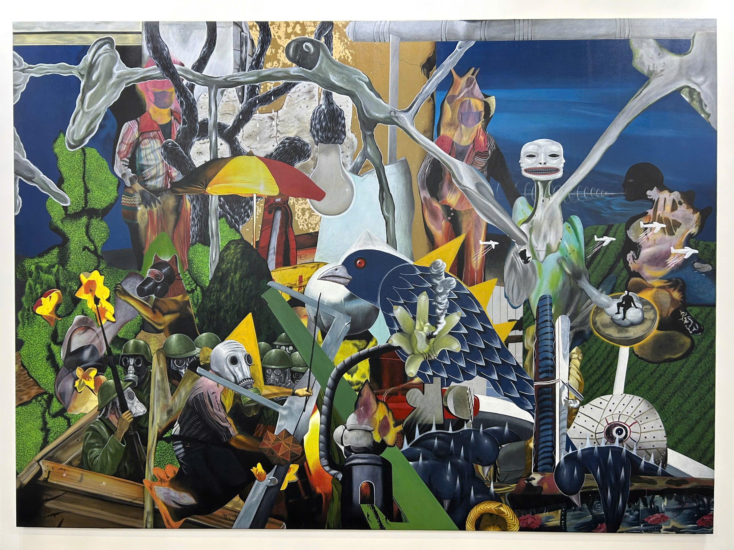 Khép lại hành trình thưởng lãm bằng một cái nhìn sâu sắc về văn hóa xã hội là nghệ sỹ Philippines Rodel Tapaya, cũng tại gian trưng bày của Tang Contemporary. Trong “Kẻ mang theo giông tố (Storm Bird)” và “Mang Lửa Đến (Bringing Fire)”, Tapaya vận dụng hệ thống biểu tượng thần thoại để phân tích các biến động môi trường và quá trình hiện đại hóa. Nếu “Kẻ mang theo giông tố (Storm Bird)” gắn hình tượng chim với thảm họa sinh thái, thì “Mang Lửa Đến (Bringing Fire)” tái diễn giải mô-típ chuyển giao quyền lực. Cả hai tác phẩm đều sử dụng cấu trúc đa lớp và bảng màu tương phản mạnh, tạo nên một không gian thị giác giàu tính ẩn dụ và sức gợi.