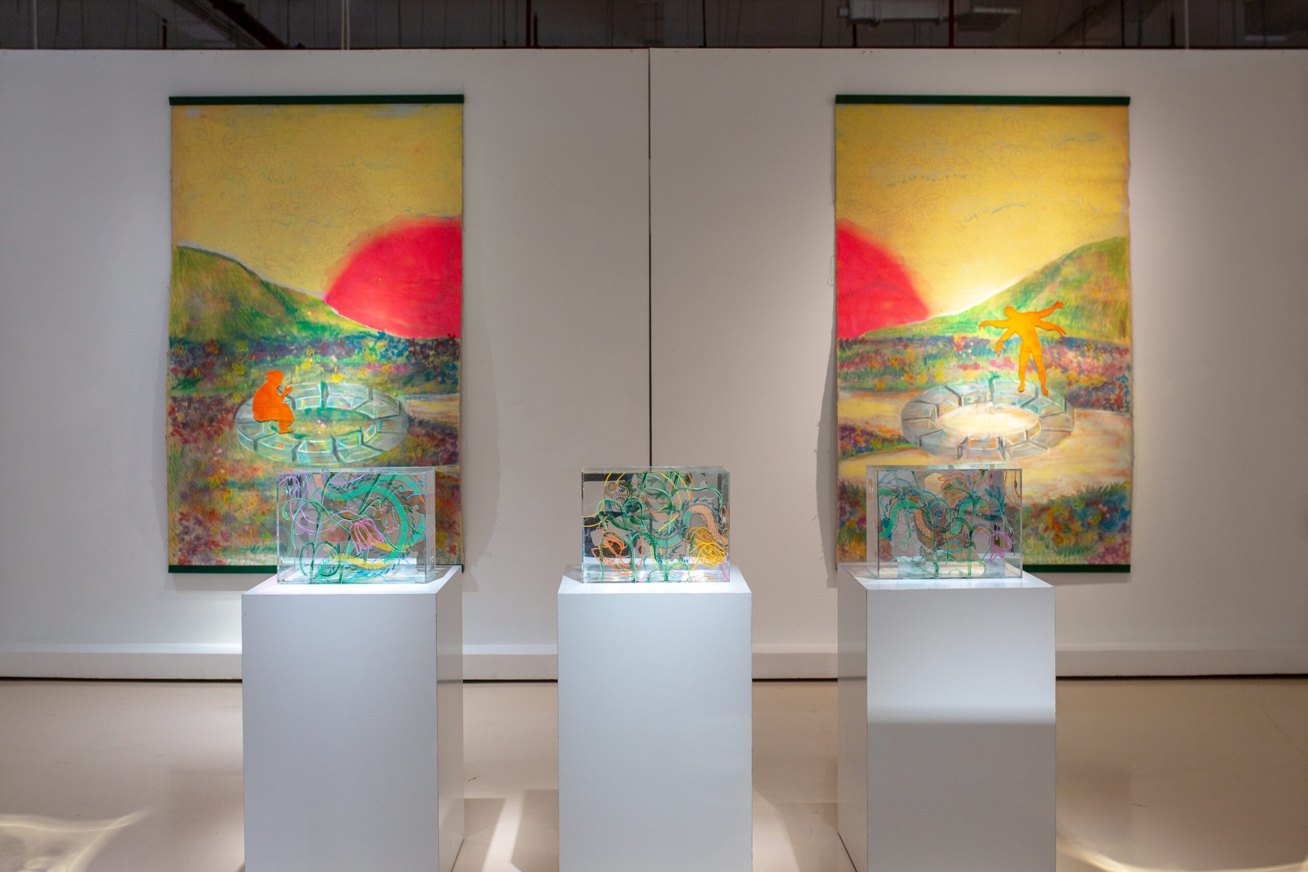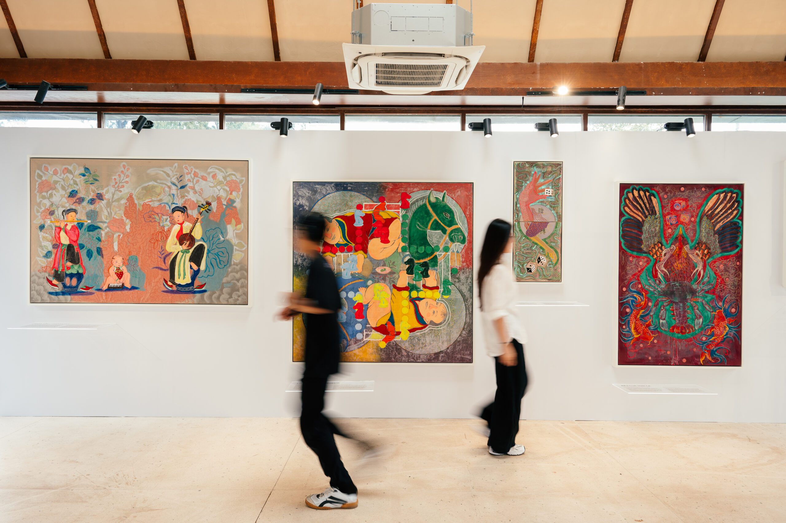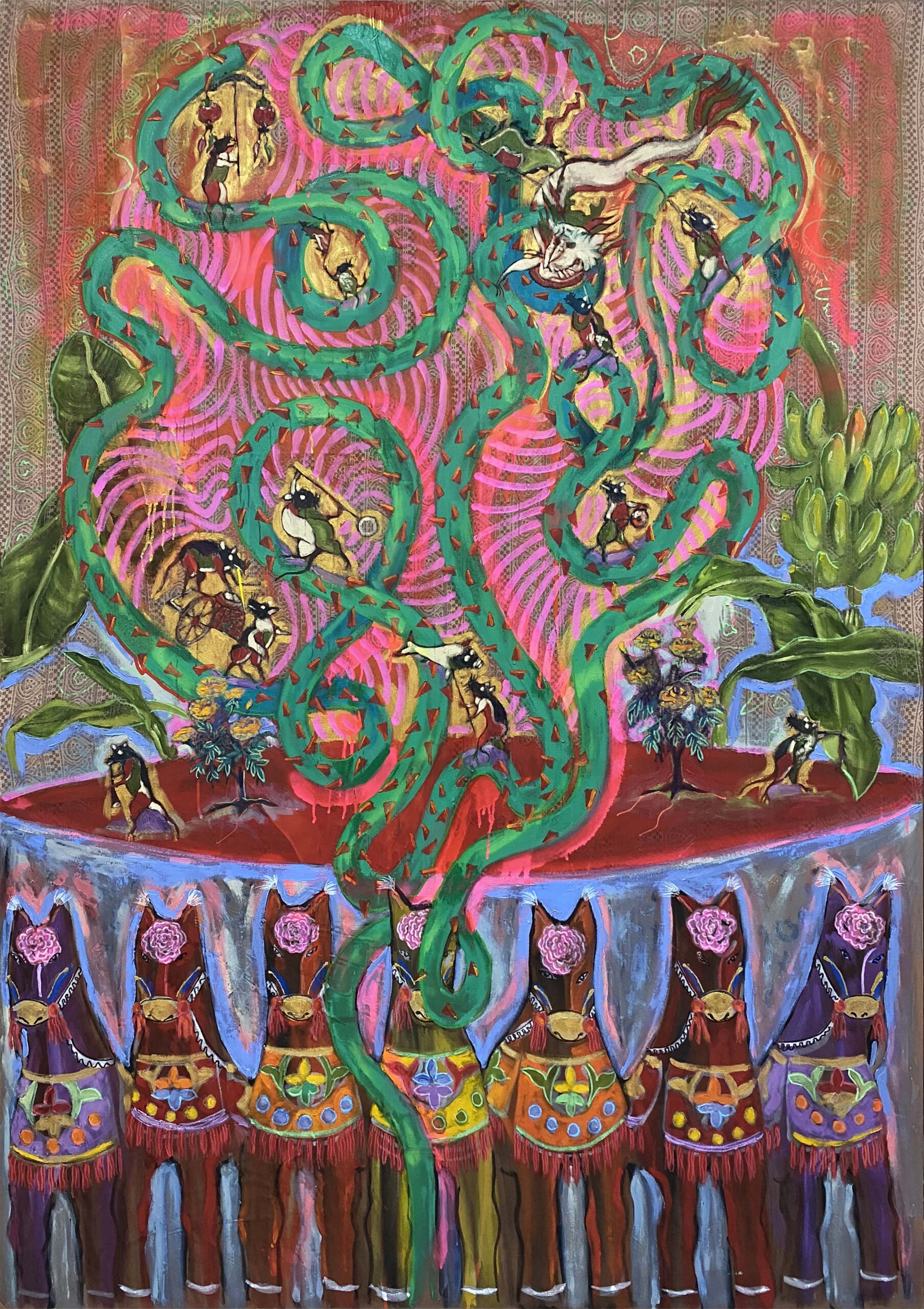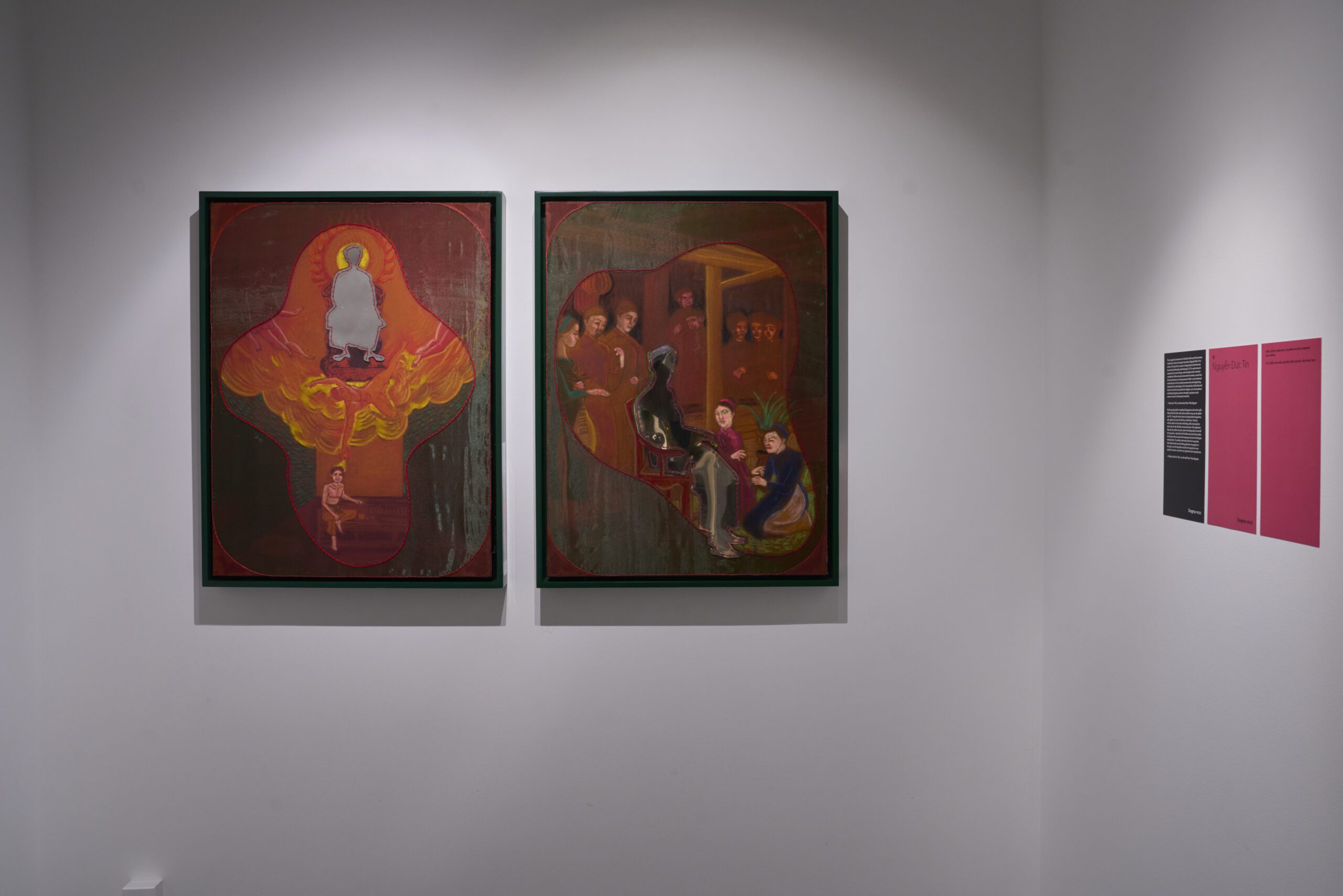 Yếu tố “vàng mã” cũng liên hệ tới cách người Việt hình dung về thế giới bên kia thông qua vật liệu rực rỡ, ánh kim. Tôi quan tâm tới sự nhập nhằng giữa thiêng và tục trong những thực hành đó, và dùng bảng màu neon như một ngôn ngữ thị giác để nói về ký ức dân gian, niềm tin truyền khẩu và các lớp huyền thoại địa phương vẫn đang tiếp tục biến đổi trong đời sống hôm nay.