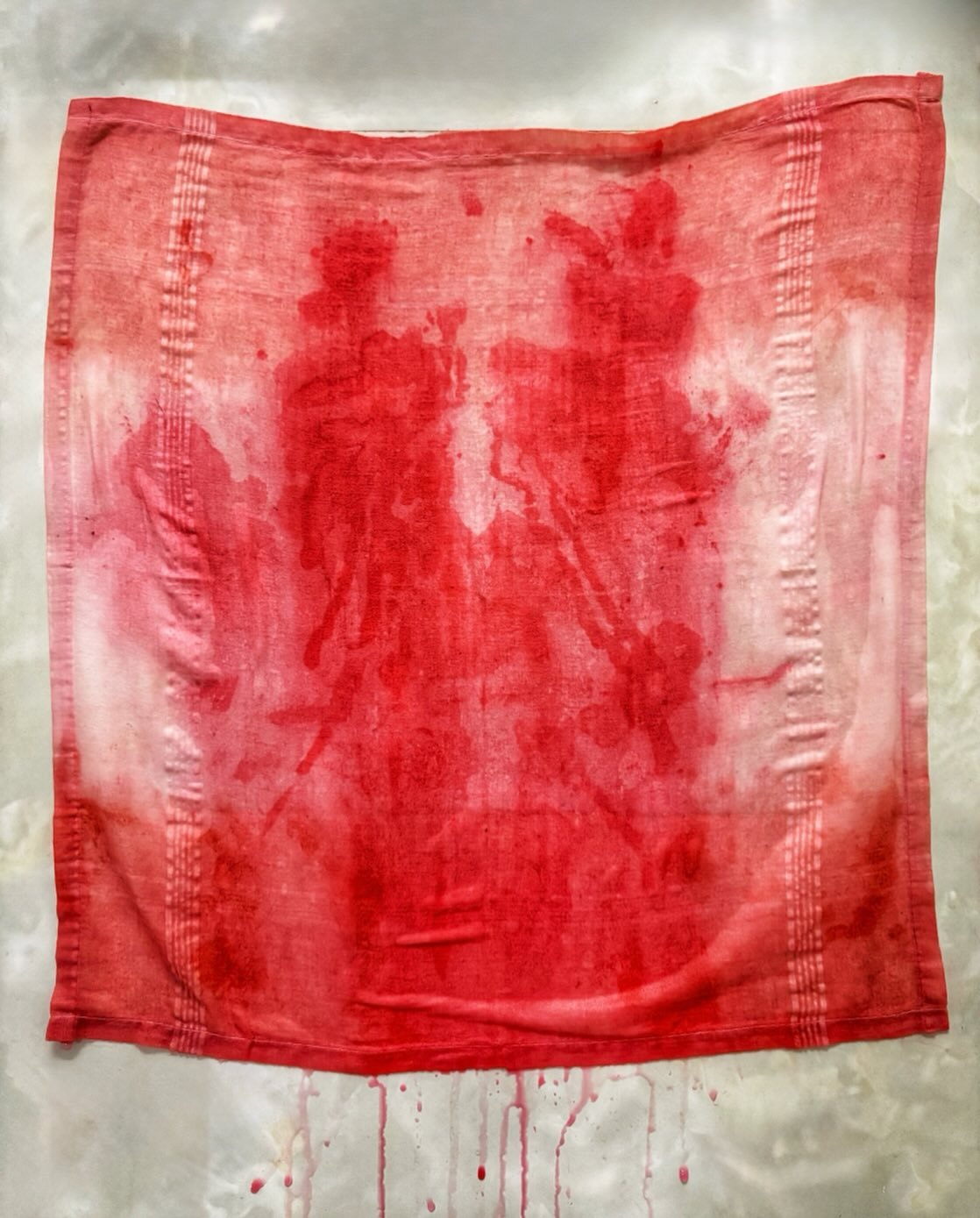 Khi làm tác phẩm này, tôi không cố tái tạo hình ảnh trên khăn liệm Turin một cách cụ thể, mà tập trung vào cảm giác sự hiện diện của một thân xác thật: dấu in mờ nhạt của thân thể, những vệt loang đỏ gợi thương tích, và bề mặt vải như mang ký ức của một biến cố đã xảy ra. Những suy niệm ấy tôi đã chuyển hóa qua việc xử lý chất liệu: để màu thấm sâu vào sợi vải, cho vết loang lan tự do, và giữ lại những khoảng trống như dấu hiệu của điều không thể nhìn thấy trọn vẹn.