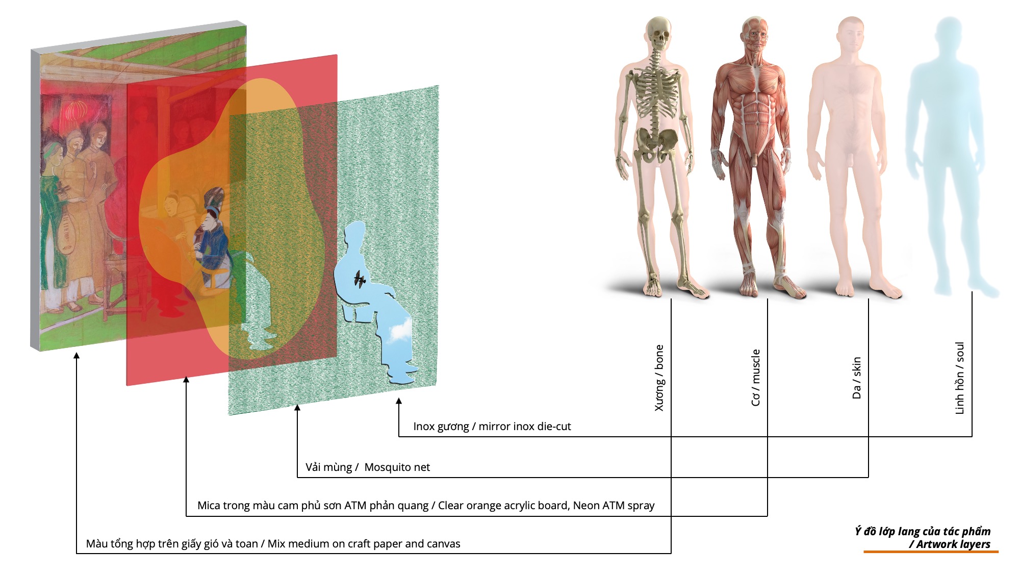 Với loạt tác phẩm “Tâm”, hoàn phẩm là những bức tranh với bốn lớp chất liệu tương ứng với bốn tầng lớp trên cơ thể con người: giấy dó, toan – xương, mica phủ sơn phản quang – cơ, vải mùng – da, mica gương – linh hồn. Anh có thể giải thích thêm về tính giải phẫu học và ý niệm của loạt tác phẩm này?
