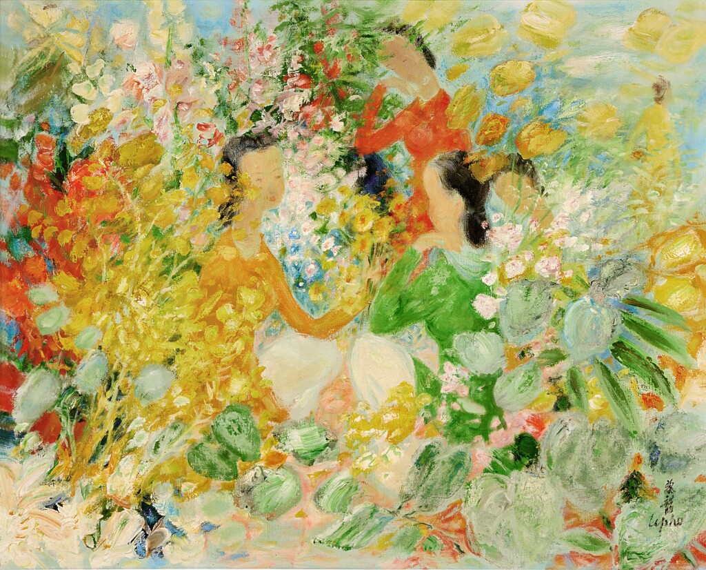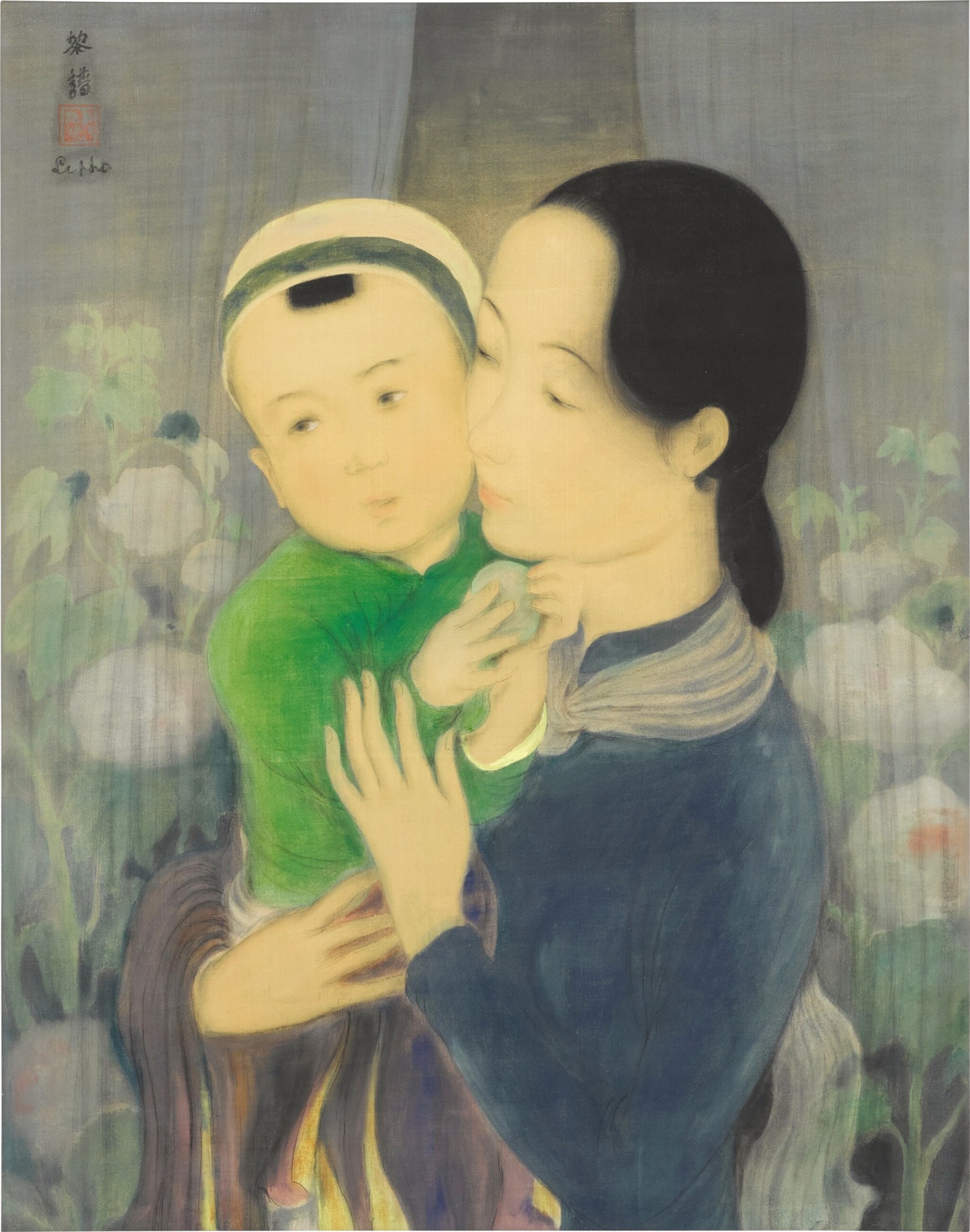 Lê Phổ, “Mẹ con và hoa (Mère et enfant, fond fleurs)” (khoảng thập niên 1940), thuộc BST gia đình Louis Guillouard ở Nantes, Pháp, với giá giao dịch hơn 1 triệu SGD.