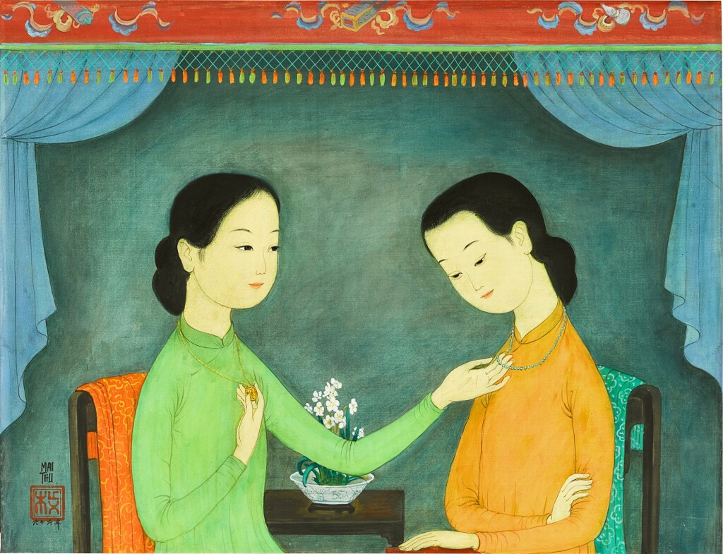 Chỉ có hai gương mặt quen thuộc là Lê Phổ và Mai Trung Thứ. Tranh lụa “Mẹ con và hoa (Mère et enfant, fond fleurs)” (khoảng thập niên 1940) của Lê Phổ có nguồn gốc từ gia đình nhà sưu tập Louis Guillouard ở Nantes, Pháp, dẫn đầu phân khúc này với giá giao dịch hơn 1 triệu SGD. Cậu bé trong tranh cũng đã từng xuất hiện trong nhiều tác phẩm khác của danh họa. Kế đến là “Làm duyên (Coquetterie)” (1966) của Mai Trung Thứ, sáng tác trong giai đoạn họa sỹ đã định hình phong cách nhất quán, gõ búa 698.500 SGD cả thuế phí. Một bức lụa khác của ông giai đoạn sớm hơn, “Làn gió (Le vent)” (1945), dừng ở mức 444.500 SGD. “Bố cục (Composition)” (khoảng thập niên 1960) của Lê Phổ là bức sơn dầu có giá cao nhất, 304.800 SGD. Những kết quả này cũng không khó đoán, bởi Phổ và Thứ là hai họa sỹ có thanh khoản lớn nhất thị trường hiện nay. Đây cũng là hai trong ba họa sỹ Việt đầu tiên lọt vào bảng xếp hạng thanh khoản thường niên của Artprice.