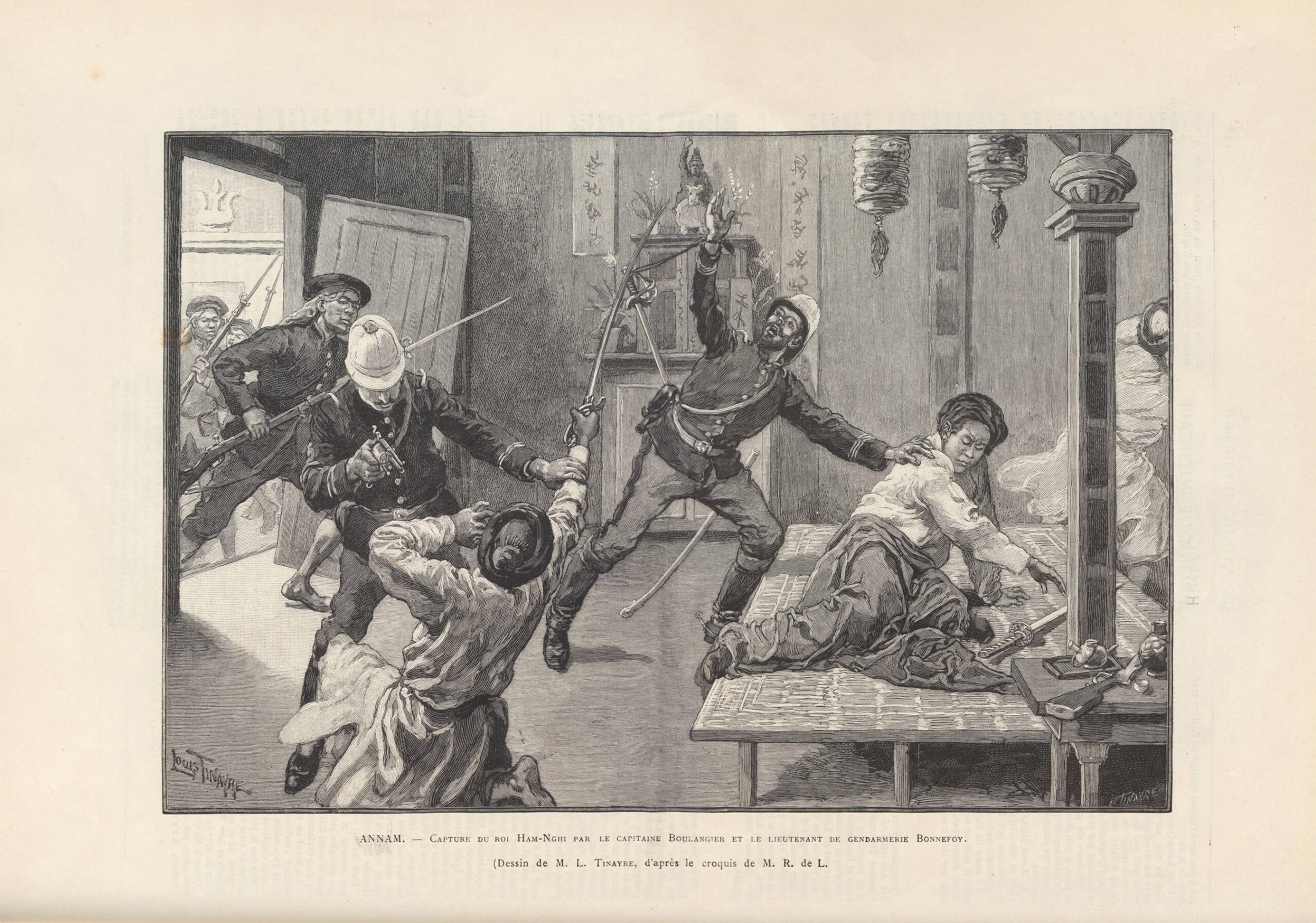 Khuyết danh, “Vụ bắt giữ cựu hoàng Hàm Nghi” (1888), tranh khắc, thuộc tuần báo Le Monde illustré ngày 23.02.1889. Ảnh: Thư viện số Gallica thuộc Thư viện Quốc gia Pháp.